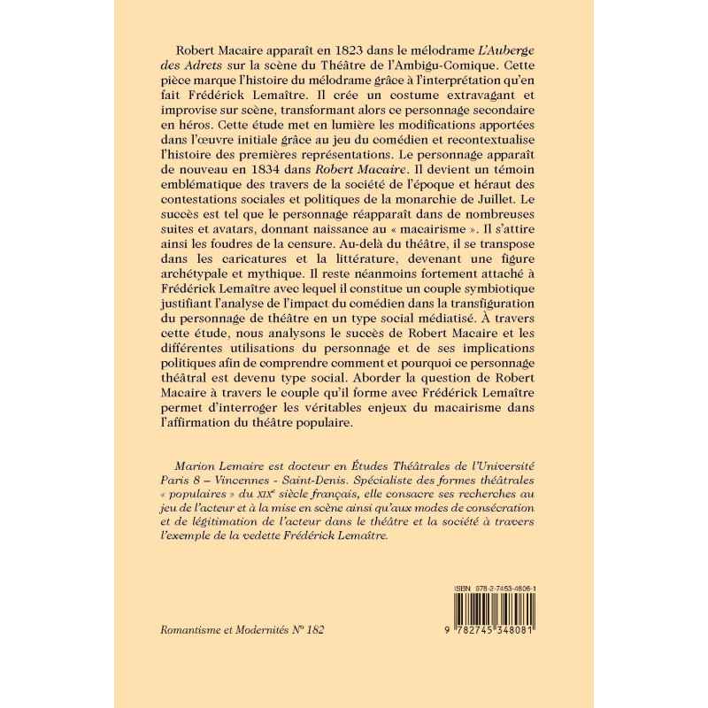 Robert Macaire apparaît en 1823 dans le mélodrame L’Auberge des Adrets sur la scène du Théâtre de l’Ambigu-Comique. Cette pièce marque l’histoire du mélodrame grâce à l’interprétation qu’en fait Frédérick Lemaître. Il crée un costume extravagant et improvise sur scène, transformant alors ce personnage secondaire en héros. Cette étude met en lumière les modifications apportées dans l’oeuvre initiale grâce au jeu du comédien et recontextualise l’histoire des premières représentations. Le personnage apparaît de nouveau en 1834 dans Robert Macaire. Il devient un témoin emblématique des travers de la société de l’époque et héraut des contestations sociales et politiques de la monarchie de Juillet. Le succès est tel que le personnage réapparaît dans de nombreuses suites et avatars, donnant naissance au « macairisme ». Il s’attire ainsi les foudres de la censure. Au-delà du théâtre, il se transpose dans les caricatures et la littérature, devenant une figure archétypale et mythique. Il reste néanmoins fortement attaché à Frédérick Lemaître avec lequel il constitue un couple symbiotique justifiant l’analyse de l’impact du comédien dans la transfiguration du personnage de théâtre en un type social médiatisé. À travers cette étude, nous analysons le succès de Robert Macaire et les différentes utilisations du personnage et de ses implications politiques afin de comprendre comment et pourquoi ce personnage théâtral est devenu type social. Aborder la question de Robert Macaire à travers le couple qu’il forme avec Frédérick Lemaître permet d’interroger les véritables enjeux du macairisme dans l’affirmation du théâtre populaire.