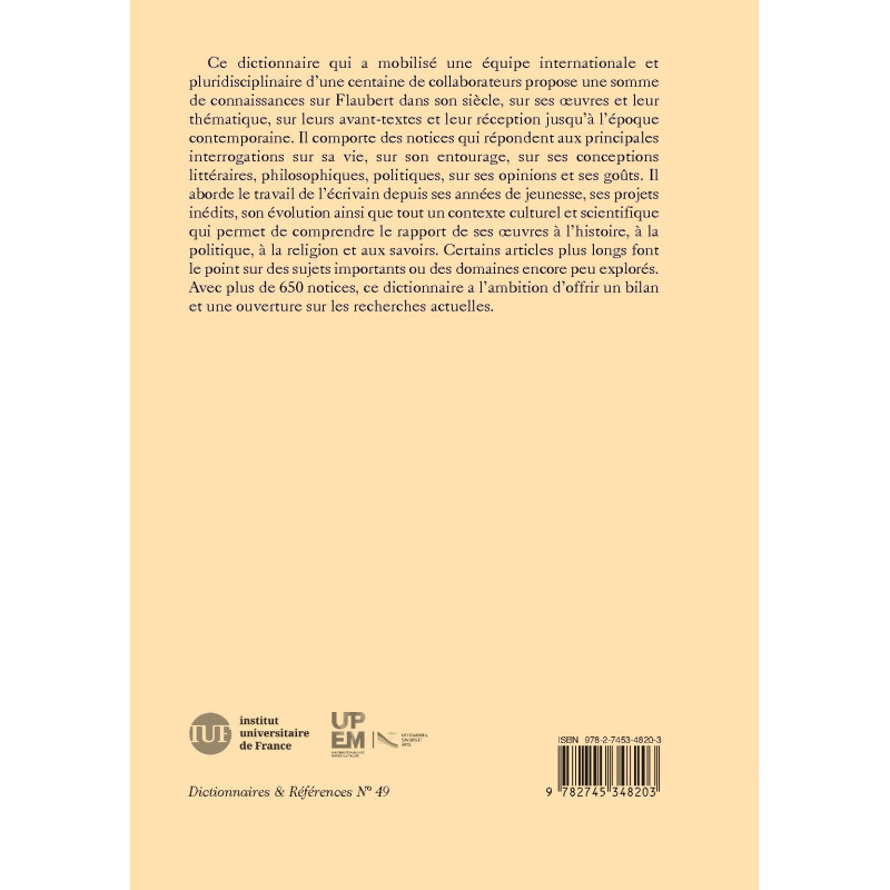 Ce dictionnaire qui a mobilisé une équipe internationale et pluridisciplinaire d'une centaine de collaborateurs propose une somme de connaissances sur Flaubert dans son siècle, sur ses œuvres et leur thématique, sur leurs avant-textes et leur réception jusqu’à l’époque contemporaine. Il comporte des notices qui répondent aux principales interrogations sur sa vie, sur son entourage, sur ses conceptions littéraires, philosophiques, politiques, sur ses opinions et ses goûts. Il aborde le travail de l’écrivain depuis ses années de jeunesse, ses projets inédits, son évolution ainsi que tout un contexte culturel et scientifique qui permet de comprendre le rapport de ses œuvres à l’histoire, à la politique, à la religion et aux savoirs. Certains articles plus longs font le point sur des sujets importants ou des domaines encore peu explorés. Avec plus de 650 notices, ce dictionnaire a l’ambition d’offrir un bilan et une ouverture sur les recherches actuelles.