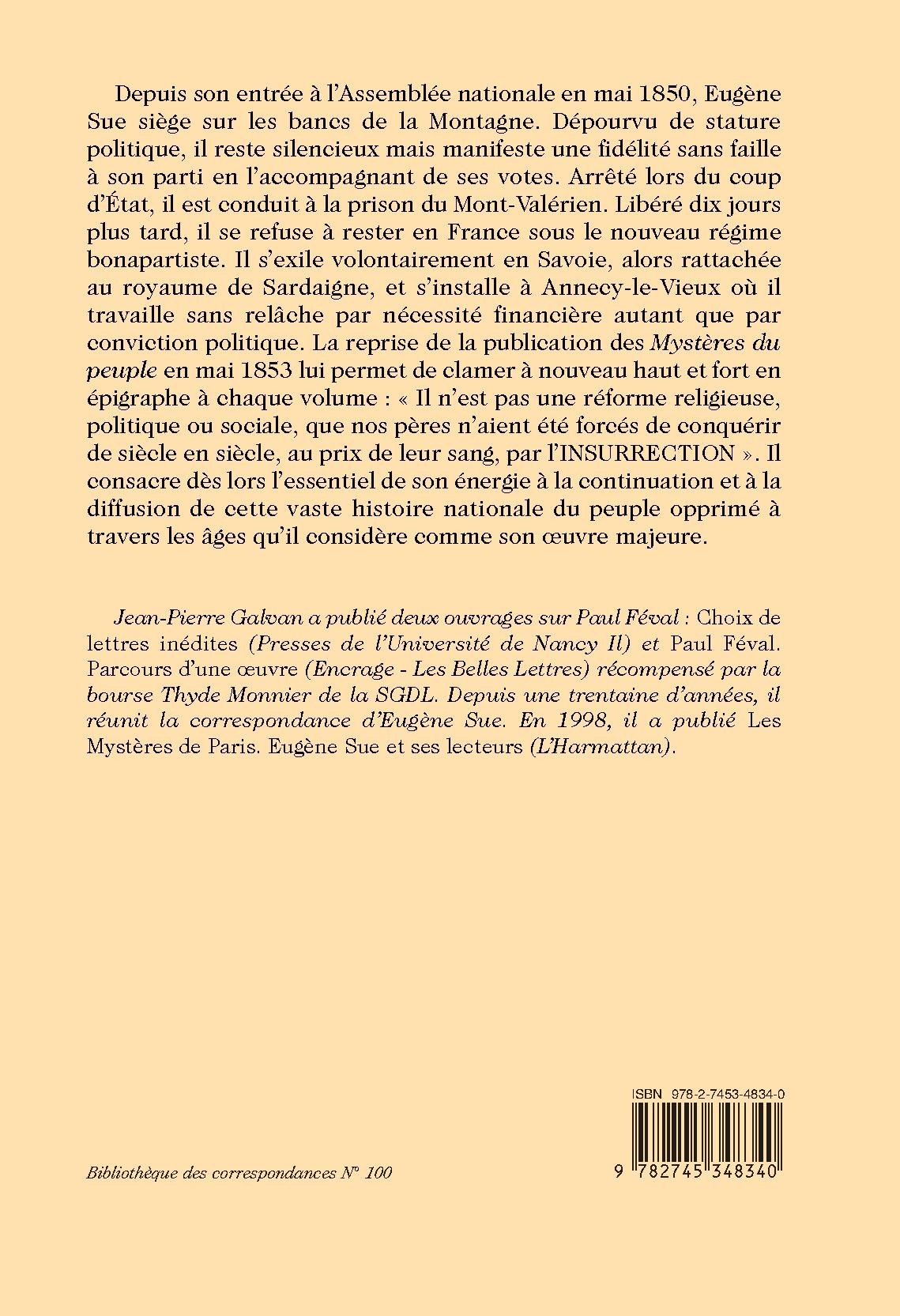 Depuis son entrée à l’Assemblée nationale en mai 1850, Eugène Sue siège sur les bancs de la Montagne. Dépourvu de stature politique, il reste silencieux mais manifeste une fidélité sans faille à son parti en l’accompagnant de ses votes. Arrêté lors du coup d’État, il est conduit à la prison du Mont-Valérien. Libéré dix jours plus tard, il se refuse à rester en France sous le nouveau régime bonapartiste. Il s’exile volontairement en Savoie, alors rattachée au royaume de Sardaigne, et s’installe à Annecy-le-Vieux où il travaille sans relâche par nécessité financière autant que par conviction politique. La reprise de la publication des Mystères du peuple en mai 1853 lui permet de clamer à nouveau haut et fort en épigraphe à chaque volume : « Il n’est pas une réforme religieuse, politique ou sociale, que nos pères n’aient été forcés de conquérir de siècle en siècle, au prix de leur sang, par l’INSURRECTION ». Il consacre dès lors l’essentiel de son énergie à la continuation et à la diffusion de cette vaste histoire nationale du peuple opprimé à travers les âges qu’il considère comme son oeuvre majeure.