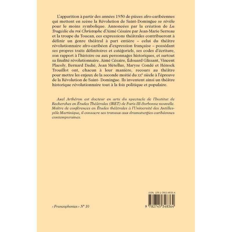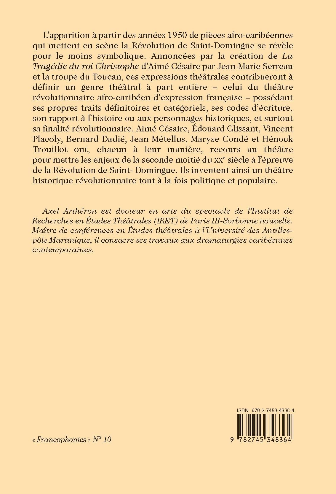 L’apparition à partir des années 1950 de pièces afro-caribéennes qui mettent en scène la Révolution de Saint-Domingue se révèle pour le moins symbolique. Annoncées par la création de La Tragédie du roi Christophe d’Aimé Césaire par Jean-Marie Serreau et la troupe du Toucan, ces expressions théâtrales contribueront à définir un genre théâtral à part entière – celui du théâtre révolutionnaire afro-caribéen d’expression française – possédant ses propres traits définitoires et catégoriels, ses codes d’écriture, son rapport à l’histoire ou aux personnages historiques, et surtout sa finalité révolutionnaire. Aimé Césaire, Édouard Glissant, Vincent Placoly, Bernard Dadié, Jean Métellus, Maryse Condé et Hénock Trouillot ont, chacun à leur manière, recours au théâtre pour mettre les enjeux de la seconde moitié du XXe siècle à l’épreuve de la Révolution de Saint- Domingue. Ils inventent ainsi un théâtre historique révolutionnaire tout à la fois politique et populaire.