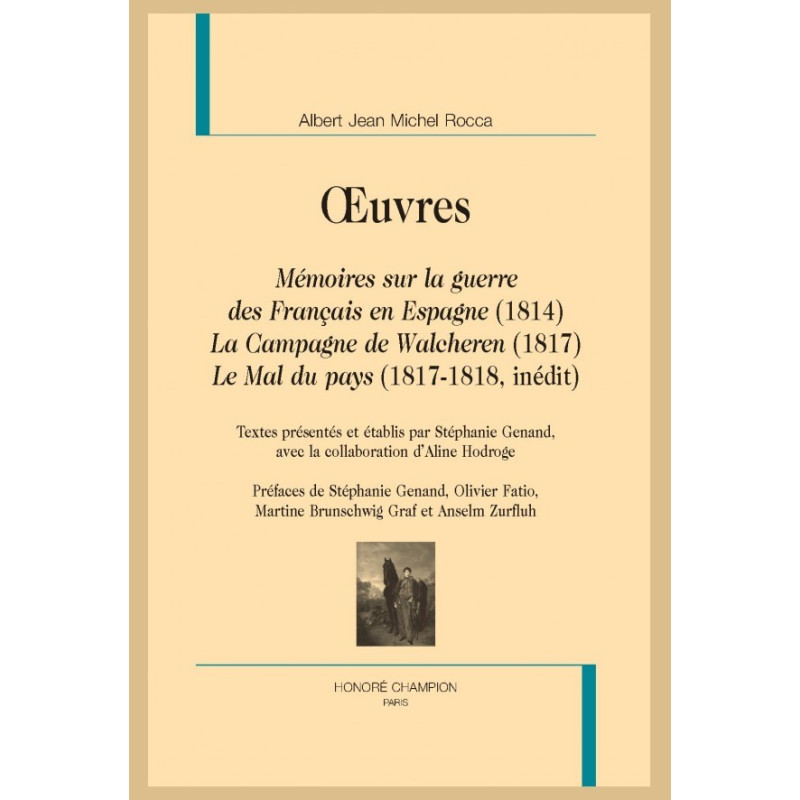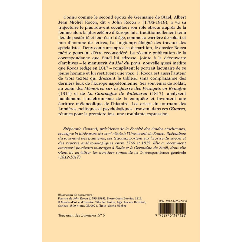 Connu comme le second époux de Germaine de Staël, Albert Jean Michel Rocca, dit « John Rocca » (1788-1818), a vu sa trajectoire le plus souvent occultée : son rôle obscur auprès de la femme alors la plus célèbre d’Europe lui a traditionnellement tenu lieu de postérité et leur écart d’âge, comme sa carrière de soldat et non d’homme de lettres, l’a longtemps éloigné des travaux des spécialistes. Deux cents ans après sa disparition, le dossier Rocca mérite pourtant d’être reconsidéré. La récente publication de la correspondance que Staël lui adresse, jointe à la découverte d’archives – le manuscrit du Mal du pays, nouvelle quasi inédite que Rocca rédige en 1817 – complètent le portrait lacunaire de ce jeune homme et lui restituent une voix : J. Rocca est aussi l’auteur de trois textes qui dressent le tableau sans complaisance des derniers feux de l’Europe napoléonienne. Ses souvenirs de soldat, au cœur des Mémoires sur la guerre des Français en Espagne (1814) et de La Campagne de Walcheren (1817), analysent lucidement l’anachronisme de la conquête et inventent une écriture mélancolique de l’histoire. Les crises du tournant des Lumières, politiques et psychologiques, trouvent dans ces OEuvres, réunies pour la première fois, une troublante expression.