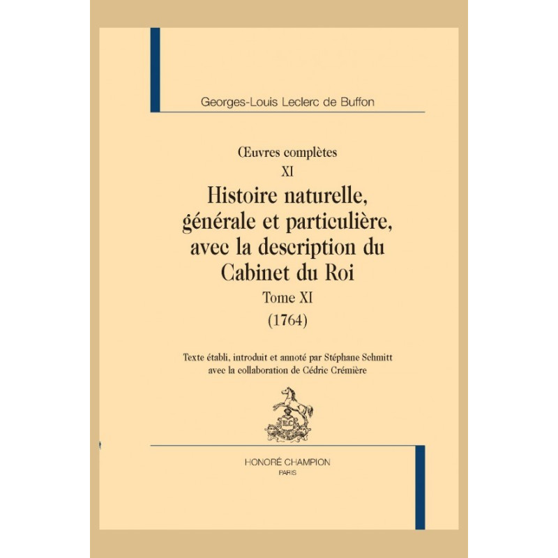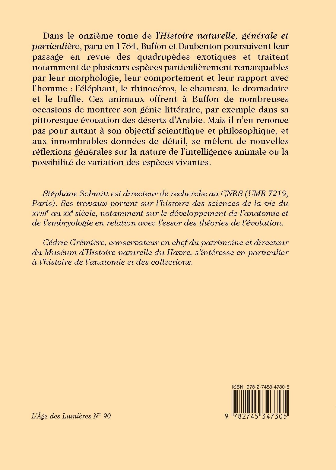 Dans le onzième tome de l’Histoire naturelle, générale et particulière, paru en 1764, Buffon et Daubenton poursuivent leur passage en revue des quadrupèdes exotiques et traitent notamment de plusieurs espèces particulièrement remarquables par leur morphologie, leur comportement et leur rapport avec l’homme : l’éléphant, le rhinocéros, le chameau, le dromadaire et le buffle. Ces animaux offrent à Buffon de nombreuses occasions de montrer son génie littéraire, par exemple dans sa pittoresque évocation des déserts d’Arabie. Mais il n’en renonce pas pour autant à son objectif scientifique et philosophique, et aux innombrables données de détail, se mêlent de nouvelles réflexions générales sur la nature de l’intelligence animale ou la possibilité de variation des espèces vivantes.