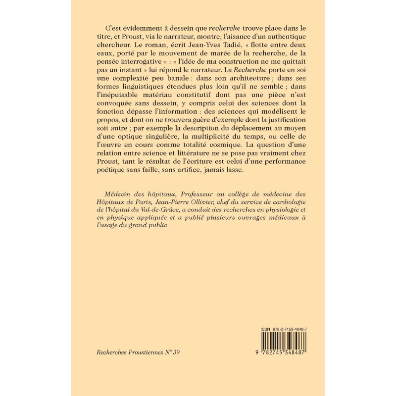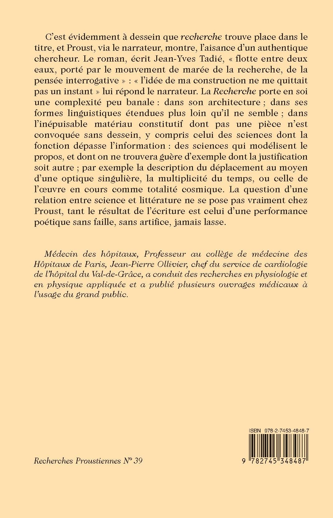 C’est évidemment à dessein que recherche trouve place dans le titre, et Proust, via le narrateur, montre, l’aisance d’un authentique chercheur. Le roman, écrit Jean-Yves Tadié, « flotte entre deux eaux, porté par le mouvement de marée de la recherche, de la pensée interrogative » : « l’idée de ma construction ne me quittait pas un instant » lui répond le narrateur. La Recherche porte en soi une complexité peu banale : dans son architecture ; dans ses formes linguistiques étendues plus loin qu’il ne semble ; dans l’inépuisable matériau constitutif dont pas une pièce n’est convoquée sans dessein, y compris celui des sciences dont la fonction dépasse l’information : des sciences qui modélisent le propos, et dont on ne trouvera guère d’exemple dont la justification soit autre ; par exemple la description du déplacement au moyen d’une optique singulière, la multiplicité du temps, ou celle de l’oeuvre en cours comme totalité cosmique. La question d’une relation entre science et littérature ne se pose pas vraiment chez Proust, tant le résultat de l’écriture est celui d’une performance poétique sans faille, sans artifice, jamais lasse.