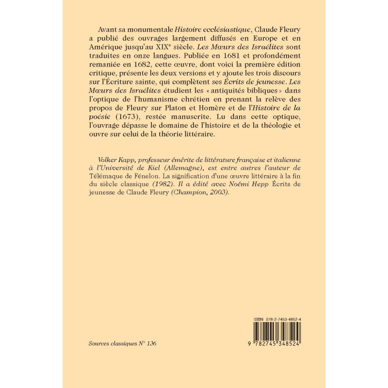 Avant sa monumentale Histoire ecclésiastique, Claude Fleury a publié des ouvrages largement diffusés en Europe et en Amérique jusqu’au XIXe siècle. Les Mœurs des Israélites sont traduites en onze langues. Publiée en 1681 et profondément remaniée en 1682, cette oeuvre, dont voici la première édition critique, présente les deux versions et y ajoute les trois discours sur l’Écriture sainte, qui complètent ses Écrits de jeunesse. Les Mœurs des Israélites étudient les « antiquités bibliques » dans l’optique de l’humanisme chrétien en prenant la relève des propos de Fleury sur Platon et Homère et de l’Histoire de la poésie (1673), restée manuscrite. Lu dans cette optique, l’ouvrage dépasse le domaine de l’histoire et de la théologie et ouvre sur celui de la théorie littéraire.