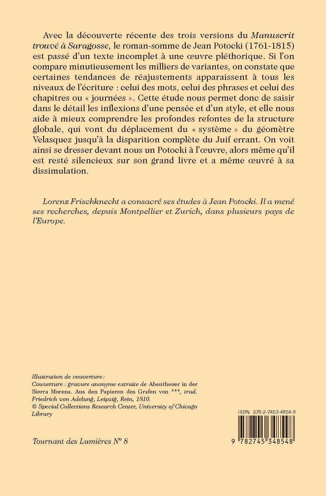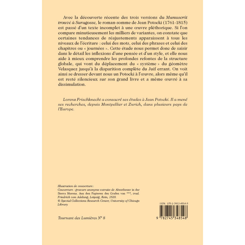 Avec la découverte récente des trois versions du Manuscrit trouvé à Saragosse, le roman-somme de Jean Potocki (1761-1815) est passé d’un texte incomplet à une oeuvre pléthorique. Si l’on compare minutieusement les milliers de variantes, on constate que certaines tendances de réajustements apparaissent à tous les niveaux de l’écriture : celui des mots, celui des phrases et celui des chapitres ou « journées ». Cette étude nous permet donc de saisir dans le détail les inflexions d’une pensée et d’un style, et elle nous aide à mieux comprendre les profondes refontes de la structure globale, qui vont du déplacement du « système » du géomètre Velasquez jusqu’à la disparition complète du Juif errant. On voit ainsi se dresser devant nous un Potocki à l’oeuvre, alors même qu’il est resté silencieux sur son grand livre et a même œuvré à sa dissimulation.