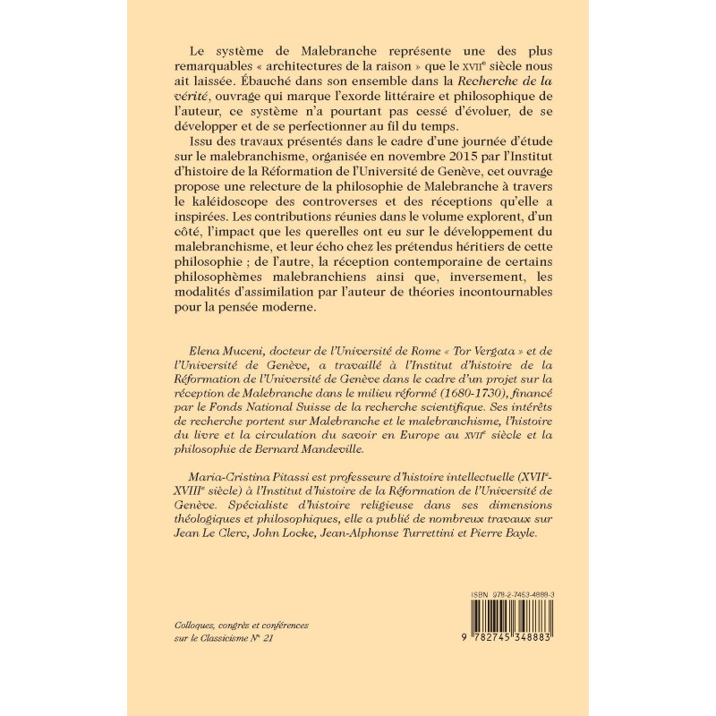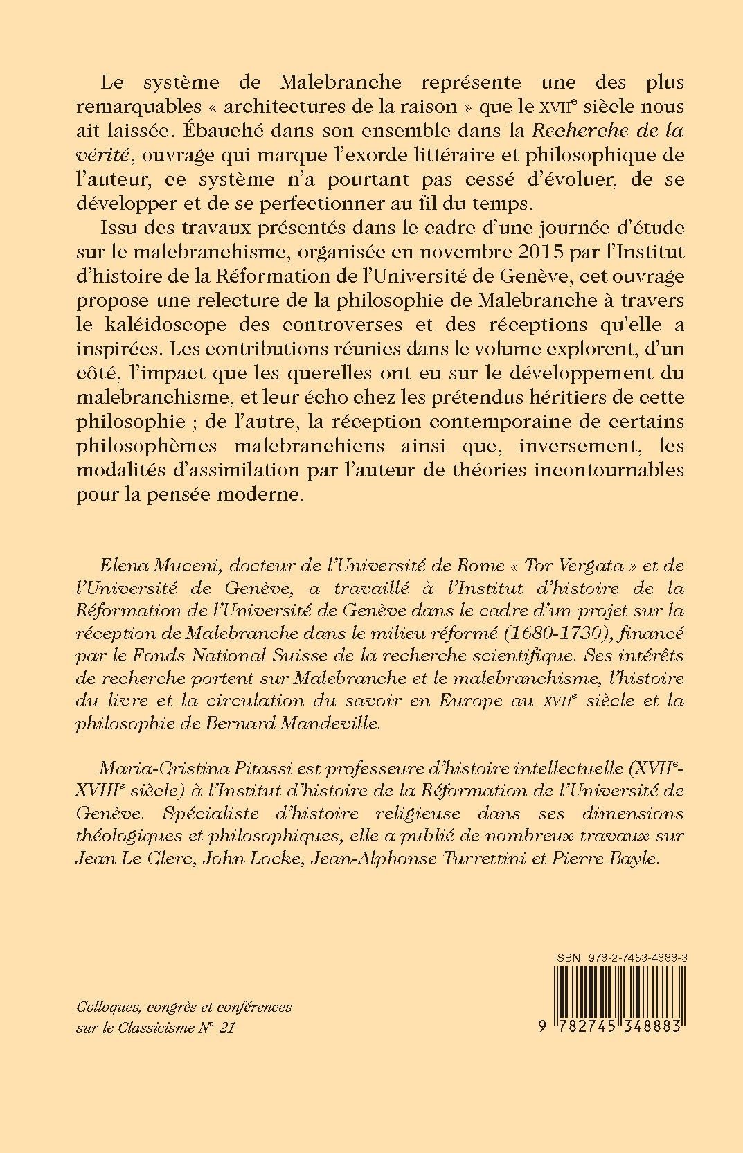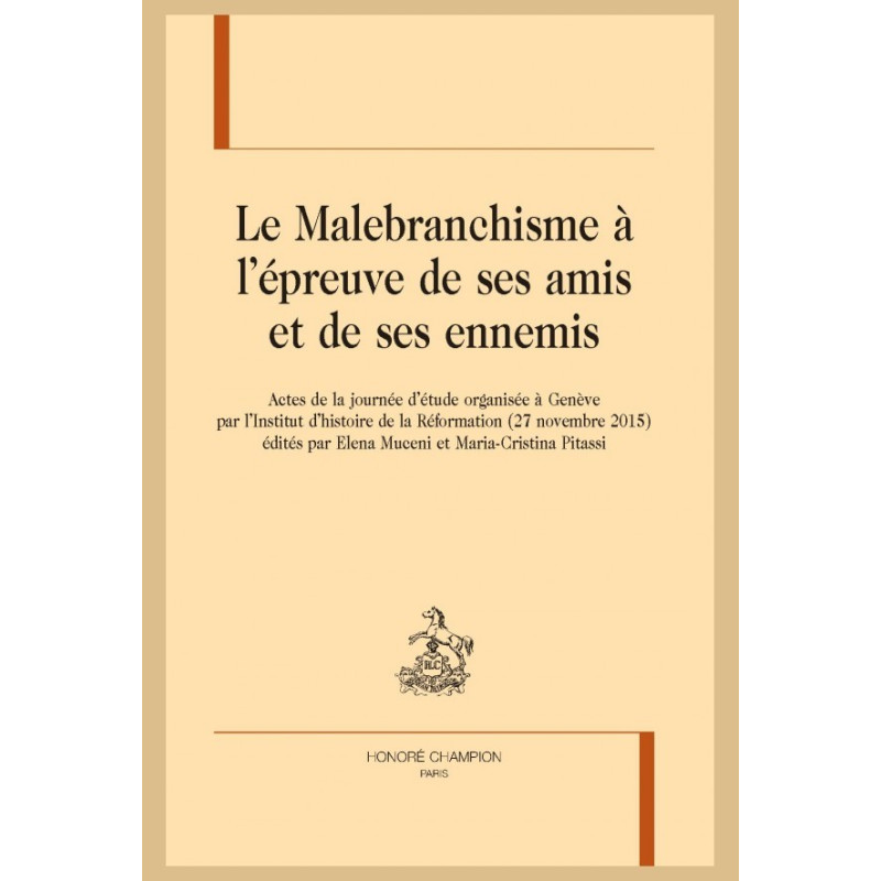 Issu des travaux présentés dans le cadre d’une journée d’étude sur le malebranchisme, organisée en novembre 2015 par l’Institut d’histoire de la Réformation de l’Université de Genève, cet ouvrage propose une relecture de la philosophie de Malebranche à travers le kaléidoscope des controverses et des réceptions qu’elle a inspirées. Les contributions réunies dans le volume explorent, d’un côté, l’impact que les querelles ont eu sur le développement du malebranchisme, et leur écho chez les prétendus héritiers de cette philosophie ; de l’autre, la réception contemporaine de certains philosophèmes malebranchiens ainsi que, inversement, les modalités d’assimilation par l’auteur de théories incontournables pour la pensée moderne.