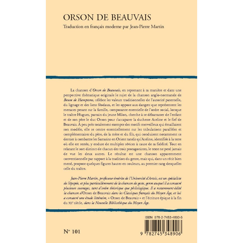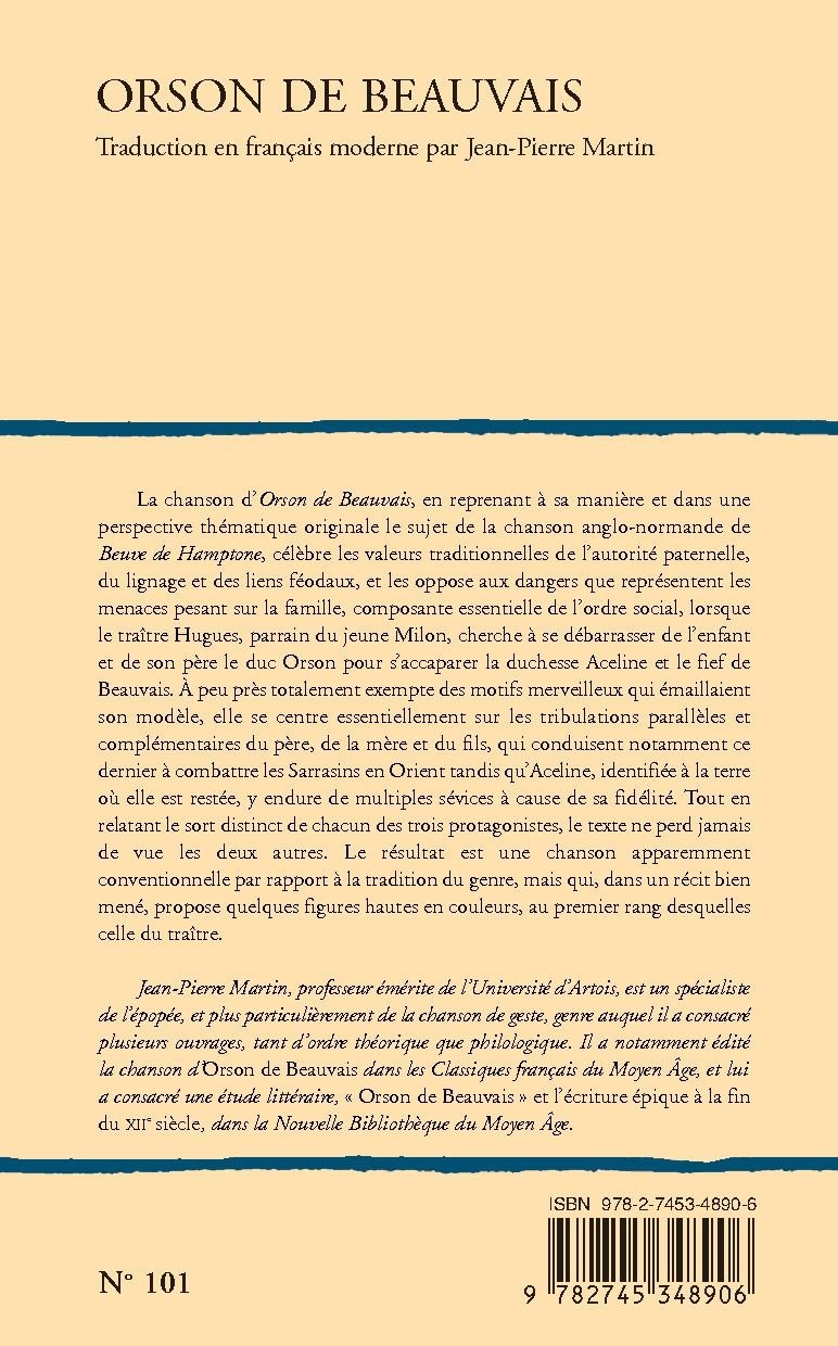 Jean-Pierre Martin, professeur émérite de l’Université d’Artois, est un spécialiste de l’épopée, et plus particulièrement de la chanson de geste, genre auquel il a consacré plusieurs ouvrages, tant d’ordre théorique que philologique. Il a notamment édité la chanson d’Orson de Beauvais dans les Classiques français du Moyen Âge, et lui a consacré une étude littéraire, « Orson de Beauvais » et l’écriture épique à la fin du XIIe siècle, dans la Nouvelle Bibliothèque du Moyen Âge.