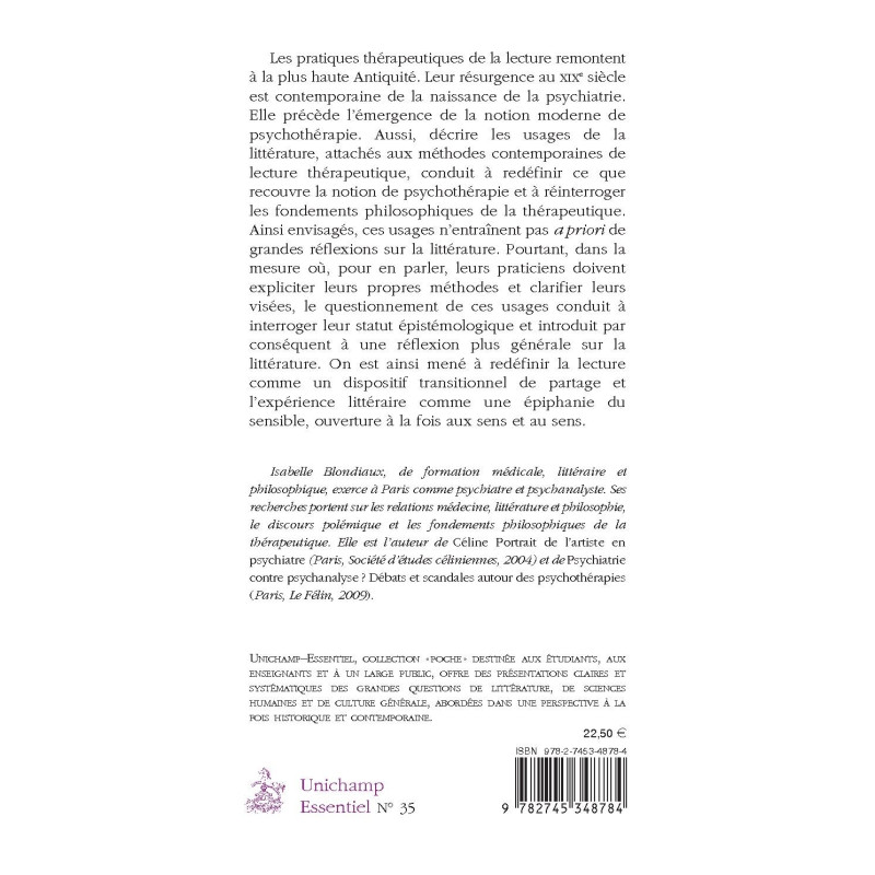 Les pratiques thérapeutiques de la lecture remontent à la plus haute Antiquité. Leur résurgence au XIXe siècle est contemporaine de la naissance de la psychiatrie. Elle précède l’émergence de la notion moderne de psychothérapie. Aussi, décrire les usages de la littérature, attachés aux méthodes contemporaines de lecture thérapeutique, conduit à redéfinir ce que recouvre la notion de psychothérapie et à réinterroger les fondements philosophiques de la thérapeutique. Ainsi envisagés, ces usages n’entraînent pas a priori de grandes réflexions sur la littérature. Pourtant, dans la mesure où, pour en parler, leurs praticiens doivent expliciter leurs propres méthodes et clarifier leurs visées, le questionnement de ces usages conduit à interroger leur statut épistémologique et introduit par conséquent à une réflexion plus générale sur la littérature. On est ainsi mené à redéfinir la lecture comme un dispositif transitionnel de partage et l’expérience littéraire comme une épiphanie du sensible, ouverture à la fois aux sens et au sens.
