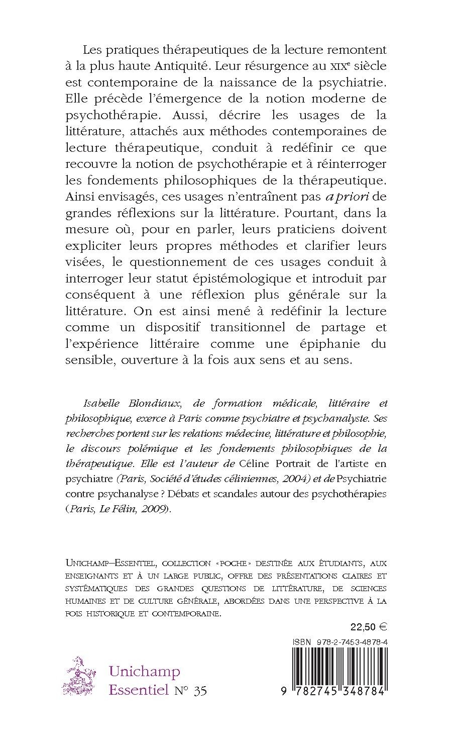 Isabelle Blondiaux, de formation médicale, littéraire et philosophique, exerce à Paris comme psychiatre et psychanalyste. Ses recherches portent sur les relations médecine, littérature et philosophie, le discours polémique et les fondements philosophiques de la thérapeutique. Elle est l’auteur de Céline Portrait de l’artiste en psychiatre (Paris, Société d’études céliniennes, 2004) et de Psychiatrie contre psychanalyse ? Débats et scandales autour des psychothérapies (Paris, Le Félin, 2009).