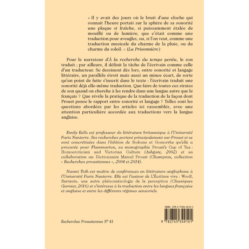 Pour le narrateur d’À la recherche du temps perdu, le son traduit ; par ailleurs, il définit la tâche de l’écrivain comme celle d’un traducteur. Se dessinent dès lors, entre sonorité et langage littéraire, un parallèle étroit mais aussi un mince écart, de sorte qu’un point de fuite s’inscrit dans le texte : l’écrivain traduit une sonorité déjà elle-même traduction. Que faire de toutes ces strates de son quand on cherche à les rendre dans une langue autre que le français ? Que révèle la pratique de la traduction de la façon dont Proust pense le rapport entre sonorité et langage ? Telles sont les questions abordées par les articles ici rassemblés, avec une attention particulière accordée aux traductions vers la langue anglaise.