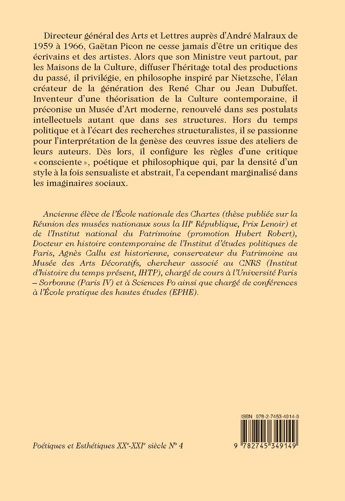 Directeur général des Arts et Lettres auprès d’André Malraux de 1959 à 1966, Gaëtan Picon ne cesse jamais d’être un critique des écrivains et des artistes. Alors que son Ministre veut partout, par les Maisons de la Culture, diffuser l’héritage total des productions du passé, il privilégie, en philosophe inspiré par Nietzsche, l’élan créateur de la génération des René Char ou Jean Dubuffet. Inventeur d’une théorisation de la Culture contemporaine, il préconise un Musée d’Art moderne, renouvelé dans ses postulats intellectuels autant que dans ses structures. Hors du temps politique et à l’écart des recherches structuralistes, il se passionne pour l’interprétation de la genèse des œuvres issue des ateliers de leurs auteurs. Dès lors, il configure les règles d’une critique « consciente », poétique et philosophique qui, par la densité d’un style à la fois sensualiste et abstrait, l’a cependant marginalisé dans les imaginaires sociaux.