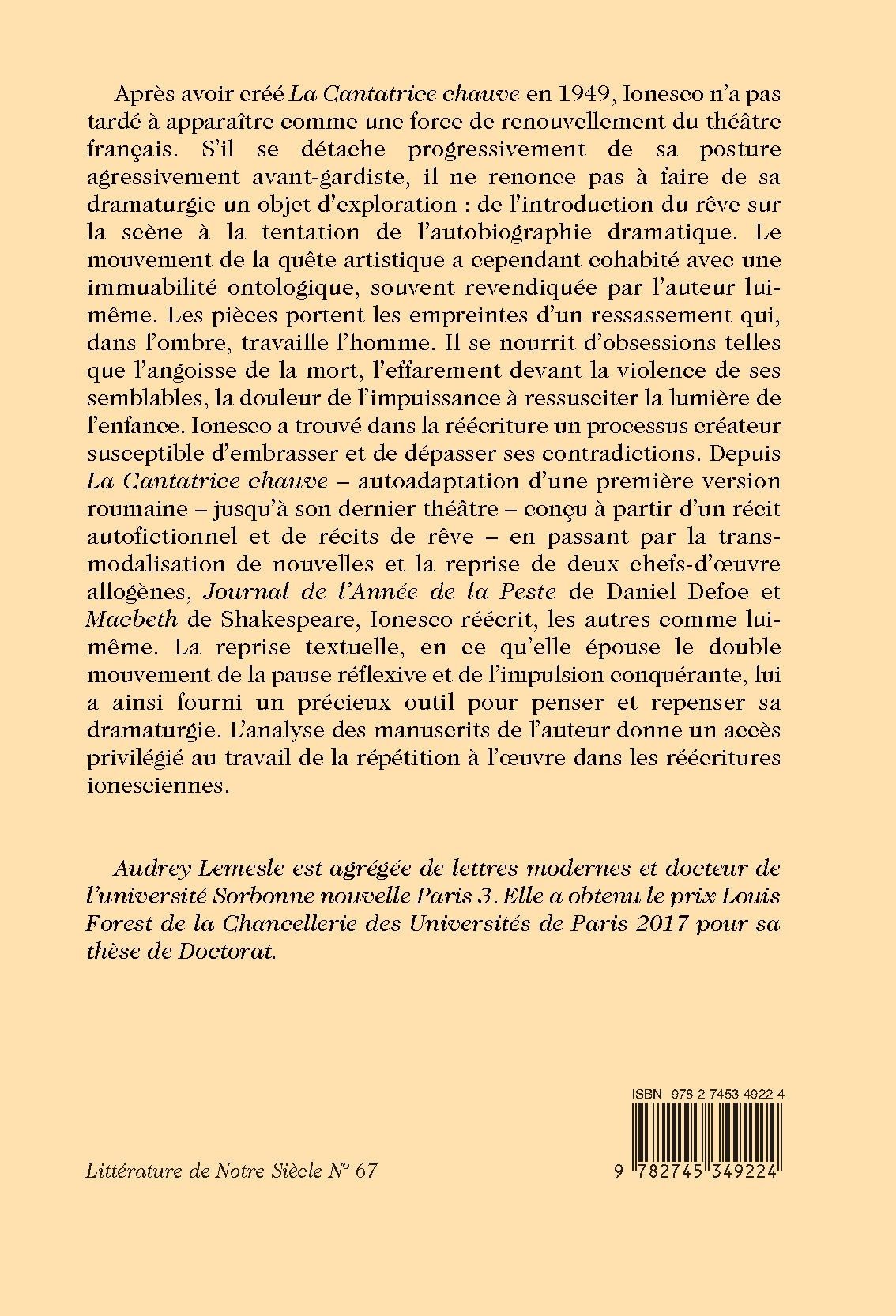 Après avoir créé La Cantatrice chauve en 1949, Ionesco n’a pas tardé à apparaître comme une force de renouvellement du théâtre français. S’il se détache progressivement de sa posture agressivement avant-gardiste, il ne renonce pas à faire de sa dramaturgie un objet d’exploration : de l’introduction du rêve sur la scène à la tentation de l’autobiographie dramatique. Le mouvement de la quête artistique a cependant cohabité avec une immuabilité ontologique, souvent revendiquée par l’auteur lui-même. Les pièces portent les empreintes d’un ressassement qui, dans l’ombre, travaille l’homme. Il se nourrit d’obsessions telles que l’angoisse de la mort, l’effarement devant la violence de ses semblables, la douleur de l’impuissance à ressusciter la lumière de l’enfance. Ionesco a trouvé dans la réécriture un processus créateur susceptible d’embrasser et de dépasser ses contradictions. Depuis La Cantatrice chauve – autoadaptation d’une première version roumaine – jusqu’à son dernier théâtre – conçu à partir d’un récit autofictionnel et de récits de rêve – en passant par la transmodalisation de nouvelles et la reprise de deux chefs-d’oeuvre allogènes, Journal de l’Année de la Peste de Daniel Defoe et Macbeth de Shakespeare, Ionesco réécrit, les autres comme lui-même. La reprise textuelle, en ce qu’elle épouse le double mouvement de la pause réflexive et de l’impulsion conquérante, lui a ainsi fourni un précieux outil pour penser et repenser sa dramaturgie. L’analyse des manuscrits de l’auteur donne un accès privilégié au travail de la répétition à l’oeuvre dans les réécritures ionesciennes.