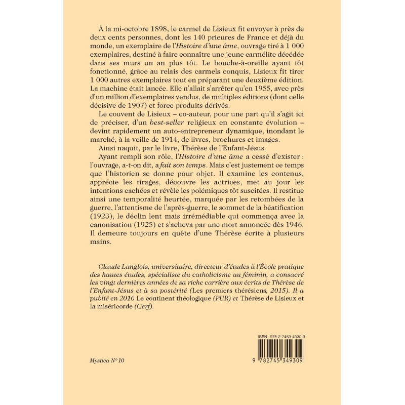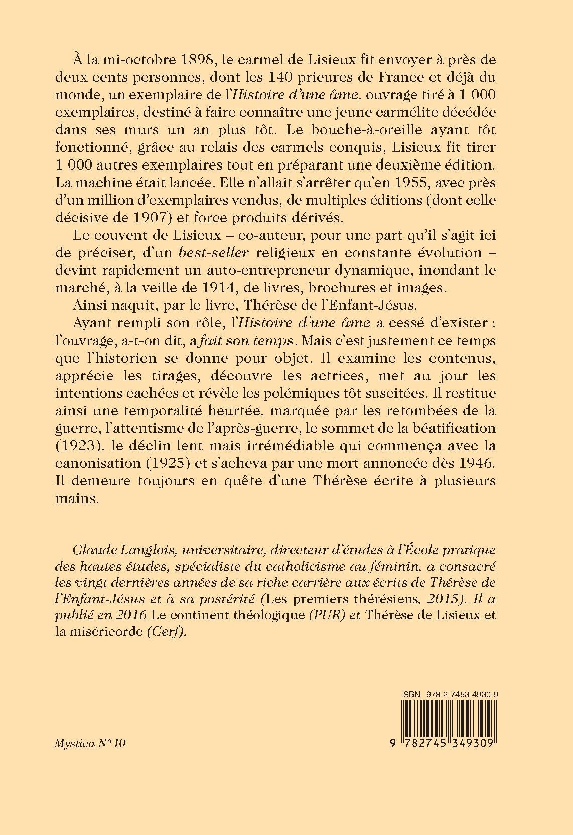 Ayant rempli son rôle, l’Histoire d’une âme a cessé d’exister : l’ouvrage, a-t-on dit, a fait son temps. Mais c’est justement ce temps que l’historien se donne pour objet. Il examine les contenus, apprécie les tirages, découvre les actrices, met au jour les intentions cachées et révèle les polémiques tôt suscitées. Il restitue ainsi une temporalité heurtée, marquée par les retombées de la guerre, l’attentisme de l’après-guerre, le sommet de la béatification (1923), le déclin lent mais irrémédiable qui commença avec la canonisation (1925) et s’acheva par une mort annoncée dès 1946. Il demeure toujours en quête d’une Thérèse écrite à plusieurs mains.