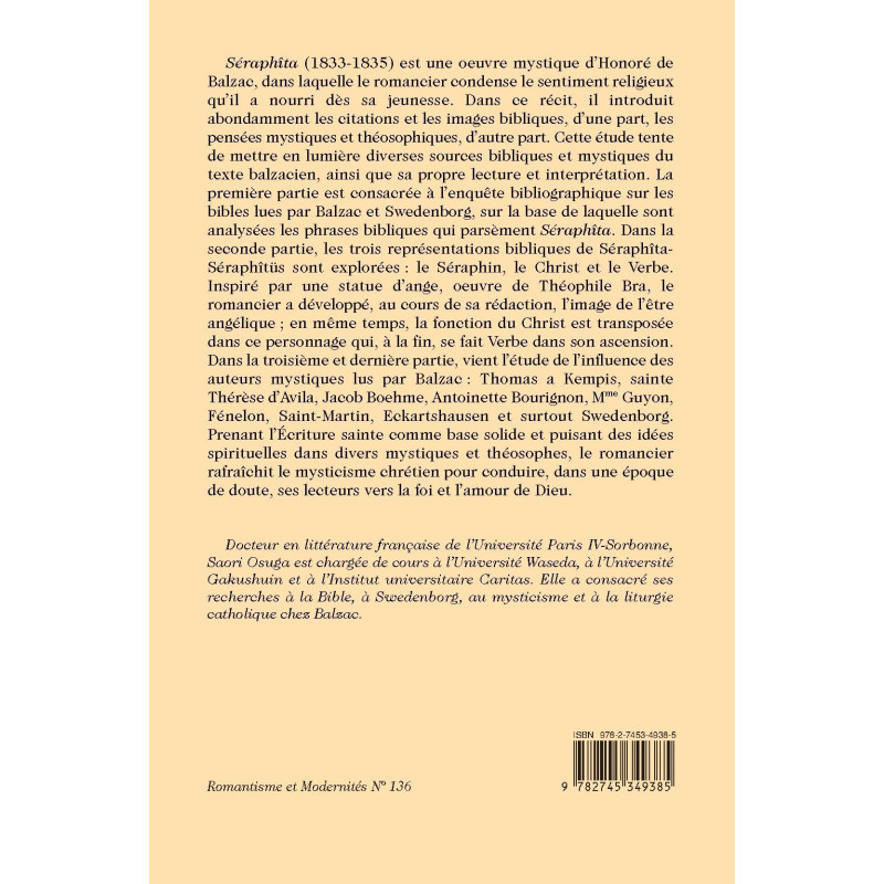 Séraphîta (1833-1835) est une oeuvre mystique d’Honoré de Balzac, dans laquelle le romancier condense le sentiment religieux qu’il a nourri dès sa jeunesse. Dans ce récit, il introduit abondamment les citations et les images bibliques, d’une part, les pensées mystiques et théosophiques, d’autre part. Cette étude tente de mettre en lumière diverses sources bibliques et mystiques du texte balzacien, ainsi que sa propre lecture et interprétation. La première partie est consacrée à l’enquête bibliographique sur les bibles lues par Balzac et Swedenborg, sur la base de laquelle sont analysées les phrases bibliques qui parsèment Séraphîta. Dans la seconde partie, les trois représentations bibliques de Séraphîta-Séraphîtüs sont explorées : le Séraphin, le Christ et le Verbe. Inspiré par une statue d’ange, oeuvre de Théophile Bra, le romancier a développé, au cours de sa rédaction, l’image de l’être angélique ; en même temps, la fonction du Christ est transposée dans ce personnage qui, à la fin, se fait Verbe dans son ascension. Dans la troisième et dernière partie, vient l’étude de l’influence des auteurs mystiques lus par Balzac : Thomas a Kempis, sainte Thérèse d’Avila, Jacob Boehme, Antoinette Bourignon, Mme Guyon, Fénelon, Saint-Martin, Eckartshausen et surtout Swedenborg. Prenant l’Écriture sainte comme base solide et puisant des idées spirituelles dans divers mystiques et théosophes, le romancier rafraîchit le mysticisme chrétien pour conduire, dans une époque de doute, ses lecteurs vers la foi et l’amour de Dieu.