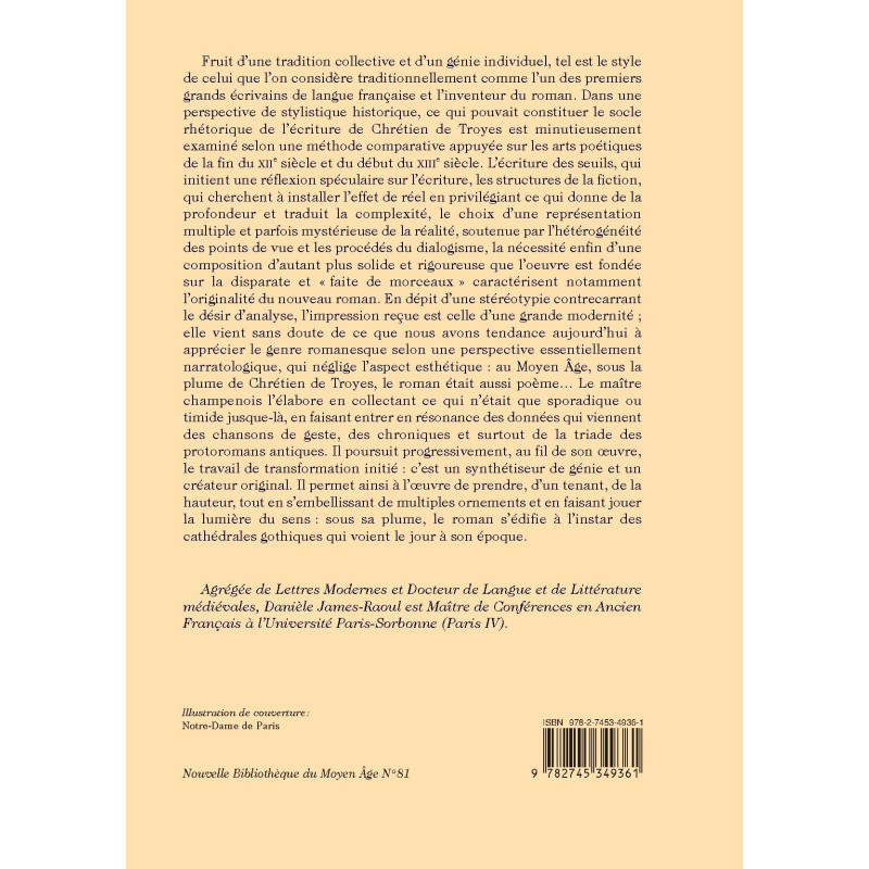 Fruit d’une tradition collective et d’un génie individuel, tel est le style de celui que l’on considère traditionnellement comme l’un des premiers grands écrivains de langue française et l’inventeur du roman. Dans une perspective de stylistique historique, ce qui pouvait constituer le socle rhétorique de l’écriture de Chrétien de Troyes est minutieusement examiné selon une méthode comparative appuyée sur les arts poétiques de la fin du XIIe siècle et du début du XIIIe siècle. L’écriture des seuils, qui initient une réflexion spéculaire sur l’écriture, les structures de la fiction, qui cherchent à installer l’effet de réel en privilégiant ce qui donne de la profondeur et traduit la complexité, le choix d’une représentation multiple et parfois mystérieuse de la réalité, soutenue par l’hétérogénéité des points de vue et les procédés du dialogisme, la nécessité enfin d’une composition d’autant plus solide et rigoureuse que l’oeuvre est fondée sur la disparate et « faite de morceaux » caractérisent notamment l’originalité du nouveau roman. En dépit d’une stéréotypie contrecarrant le désir d’analyse, l’impression reçue est celle d’une grande modernité ; elle vient sans doute de ce que nous avons tendance aujourd’hui à apprécier le genre romanesque selon une perspective essentiellement narratologique, qui néglige l’aspect esthétique : au Moyen Âge, sous la plume de Chrétien de Troyes, le roman était aussi poème… Le maître champenois l’élabore en collectant ce qui n’était que sporadique ou timide jusque-là, en faisant entrer en résonance des données qui viennent des chansons de geste, des chroniques et surtout de la triade des protoromans antiques. Il poursuit progressivement, au fil de son œuvre, le travail de transformation initié : c’est un synthétiseur de génie et un créateur original. Il permet ainsi à l’œuvre de prendre, d’un tenant, de la hauteur, tout en s’embellissant de multiples ornements et en faisant jouer la lumière du sens : sous sa plume, le roman s’édifie à l’instar des cathédrales gothiques qui voient le jour à son époque.