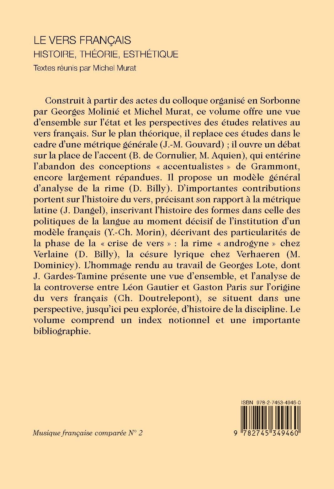 Construit à partir des actes du colloque organisé en Sorbonne par Georges Molinié et Michel Murat, ce volume offre une vue d’ensemble sur l’état et les perspectives des études relatives au vers français. Sur le plan théorique, il replace ces études dans le cadre d’une métrique générale (J.-M. Gouvard) ; il ouvre un débat sur la place de l’accent (B. de Cornulier, M. Aquien), qui entérine l’abandon des conceptions « accentualistes » de Grammont, encore largement répandues. Il propose un modèle général d’analyse de la rime (D. Billy). D’importantes contributions portent sur l’histoire du vers, précisant son rapport à la métrique latine (J. Dangel), inscrivant l’histoire des formes dans celle des politiques de la langue au moment décisif de l’institution d’un modèle français (Y.-Ch. Morin), décrivant des particularités de la phase de la « crise de vers » : la rime « androgyne » chez Verlaine (D. Billy), la césure lyrique chez Verhaeren (M. Dominicy). L’hommage rendu au travail de Georges Lote, dont J. Gardes-Tamine présente une vue d’ensemble, et l’analyse de la controverse entre Léon Gautier et Gaston Paris sur l’origine du vers français (Ch. Doutrelepont), se situent dans une perspective, jusqu’ici peu explorée, d’histoire de la discipline. Le volume comprend un index notionnel et une importante bibliographie.