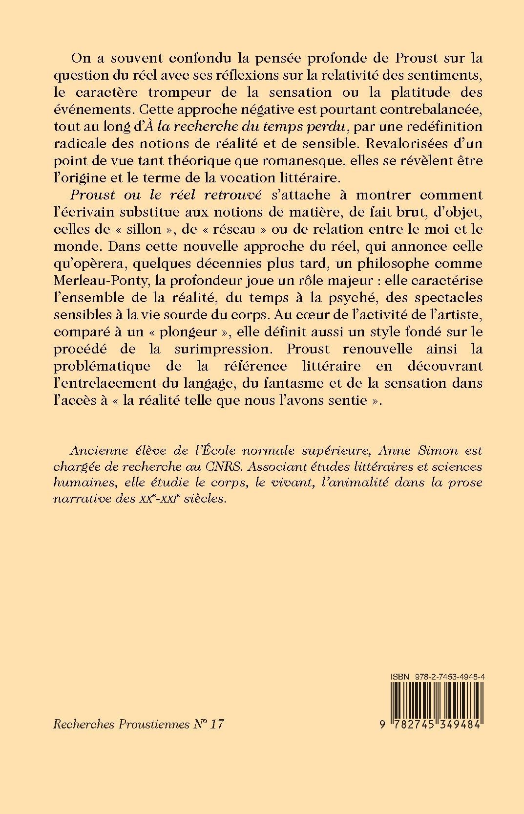 Proust ou le réel retrouvé s’attache à montrer comment l’écrivain substitue aux notions de matière, de fait brut, d’objet, celles de « sillon », de « réseau » ou de relation entre le moi et le monde. Dans cette nouvelle approche du réel, qui annonce celle qu’opèrera, quelques décennies plus tard, un philosophe comme Merleau-Ponty, la profondeur joue un rôle majeur : elle caractérise l’ensemble de la réalité, du temps à la psyché, des spectacles sensibles à la vie sourde du corps. Au cœur de l’activité de l’artiste, comparé à un « plongeur », elle définit aussi un style fondé sur le procédé de la surimpression. Proust renouvelle ainsi la problématique de la référence littéraire en découvrant l’entrelacement du langage, du fantasme et de la sensation dans l’accès à « la réalité telle que nous l’avons sentie ».