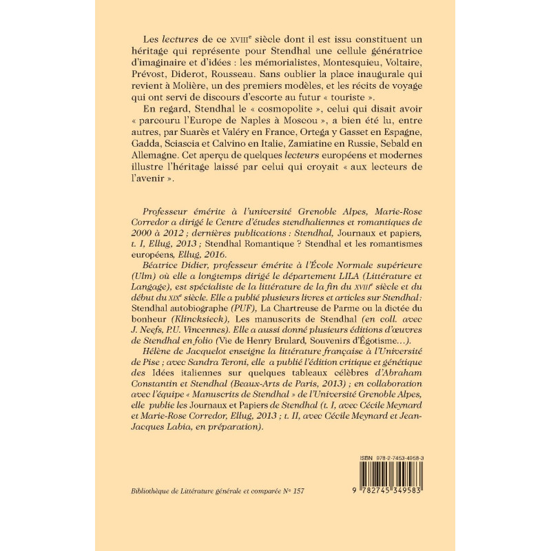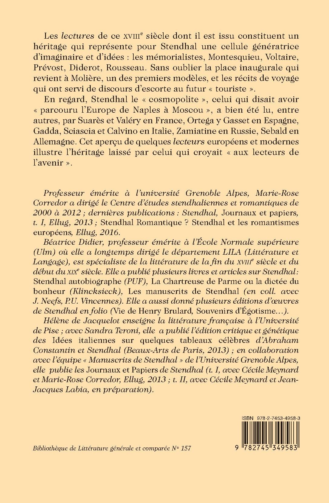 Les lectures de ce XVIIIe siècle dont il est issu constituent un héritage qui représente pour Stendhal une cellule génératrice d’imaginaire et d’idées : les mémorialistes, Montesquieu, Voltaire, Prévost, Diderot, Rousseau. Sans oublier la place inaugurale qui revient à Molière, un des premiers modèles, et les récits de voyage qui ont servi de discours d’escorte au futur « touriste ».