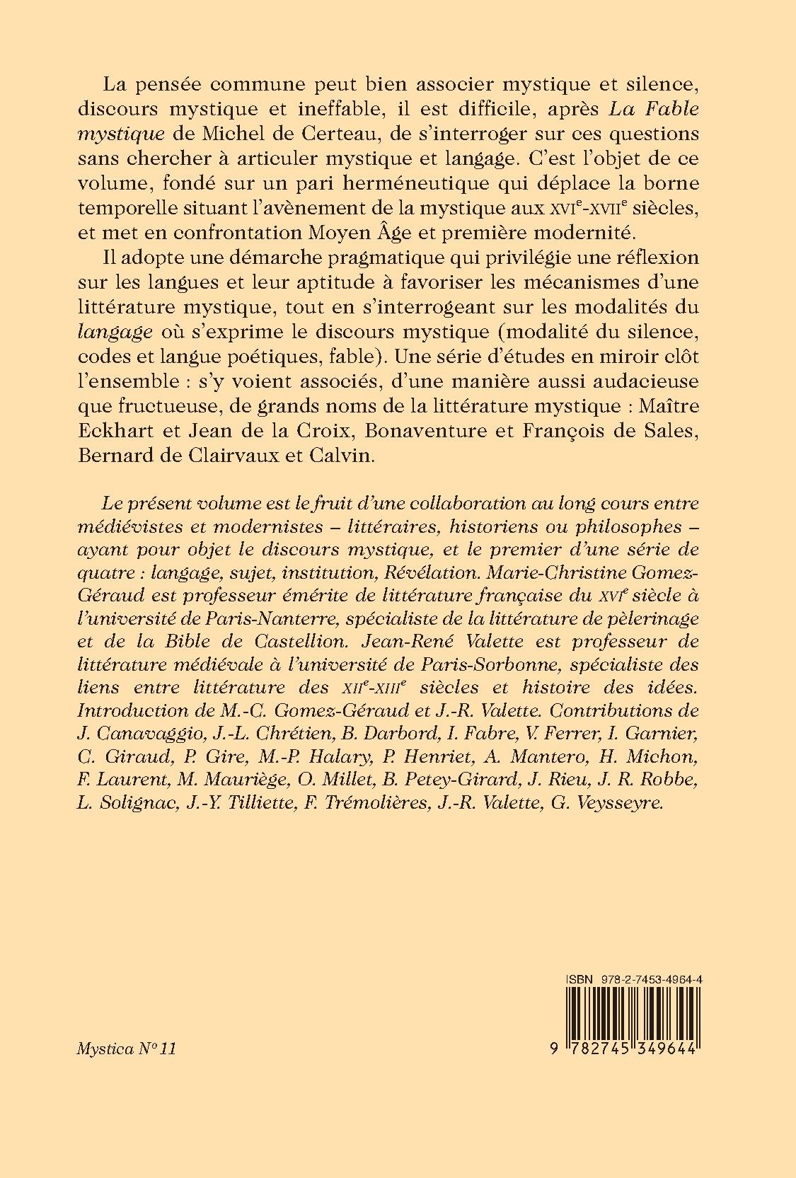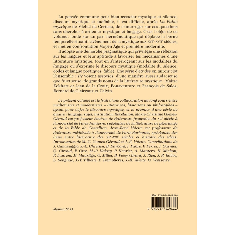 Le présent volume est le fruit d’une collaboration au long cours entre médiévistes et modernistes – littéraires, historiens ou philosophes – ayant pour objet le discours mystique, et le premier d’une série de quatre : langage, sujet, institution, Révélation. Marie-Christine Gomez- Géraud est professeur émérite de littérature française du XVIe siècle à l’université de Paris-Nanterre, spécialiste de la littérature de pèlerinage et de la Bible de Castellion. Jean-René Valette est professeur de littérature médiévale à l’université de Paris-Sorbonne, spécialiste des liens entre littérature des XIIe-XIIIe siècles et histoire des idées. Introduction de M.-C. Gomez-Géraud et J.-R. Valette. Contributions de J. Canavaggio, J.-L. Chrétien, B. Darbord, I. Fabre, V. Ferrer, I. Garnier, C. Giraud, P. Gire, M.-P. Halary, P. Henriet, A. Mantero, H. Michon, F. Laurent, M. Mauriège, O. Millet, B. Petey-Girard, J. Rieu, J. R. Robbe, L. Solignac, J.-Y. Tilliette, F. Trémolières, J.-R. Valette, G. Veysseyre.