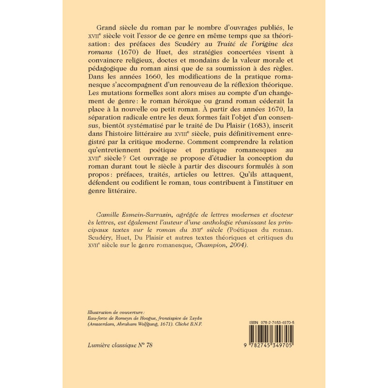 Camille Esmein-Sarrazin, agrégée de lettres modernes et docteur ès lettres, est également l’auteur d’une anthologie réunissant les principaux textes sur le roman du XVIIe siècle (Poétiques du roman. Scudéry, Huet, Du Plaisir et autres textes théoriques et critiques du XVIIe siècle sur le genre romanesque, Champion, 2004).