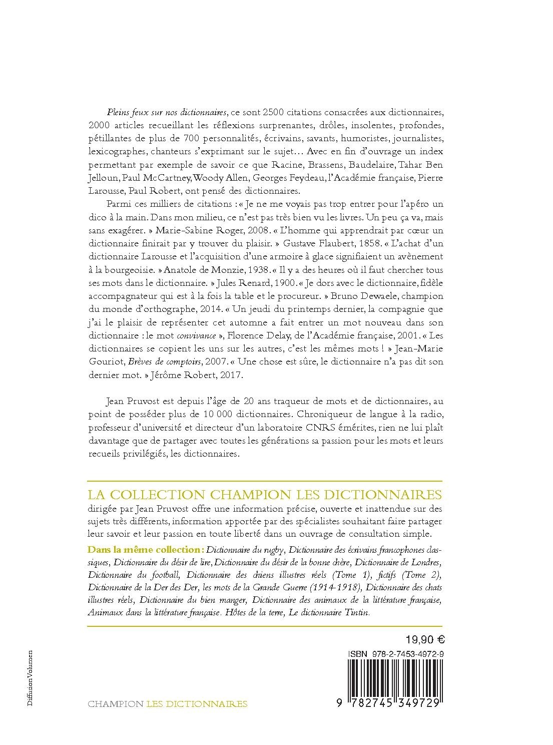 Parmi ces milliers de citations : « Je ne me voyais pas trop entrer pour l’apéro un dico à la main. Dans mon milieu, ce n’est pas très bien vu les livres. Un peu ça va, mais sans exagérer. » Marie-Sabine Roger, 2008. « L’homme qui apprendrait par cœur un dictionnaire finirait par y trouver du plaisir. » Gustave Flaubert, 1858. « L’achat d’un dictionnaire Larousse et l’acquisition d’une armoire à glace signifiaient un avènement à la bourgeoisie. » Anatole de Monzie, 1938. « Il y a des heures où il faut chercher tous ses mots dans le dictionnaire. » Jules Renard, 1900. « Je dors avec le dictionnaire, fidèle accompagnateur qui est à la fois la table et le procureur. » Bruno Dewaele, champion du monde d’orthographe, 2014. « Un jeudi du printemps dernier, la compagnie que j’ai le plaisir de représenter cet automne a fait entrer un mot nouveau dans son dictionnaire : le mot convivance », Florence Delay, de l’Académie française, 2001. « Les dictionnaires se copient les uns sur les autres, c’est les mêmes mots ! » Jean-Marie Gouriot, Brèves de comptoirs, 2007. « Une chose est sûre, le dictionnaire n’a pas dit son dernier mot. » Jérôme Robert, 2017.