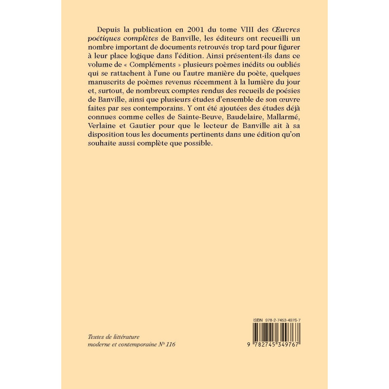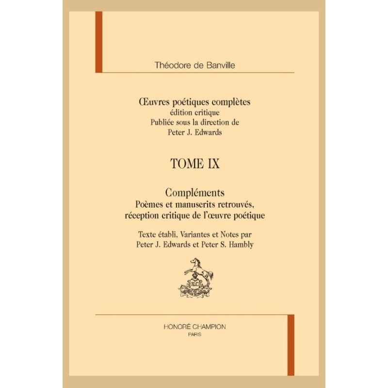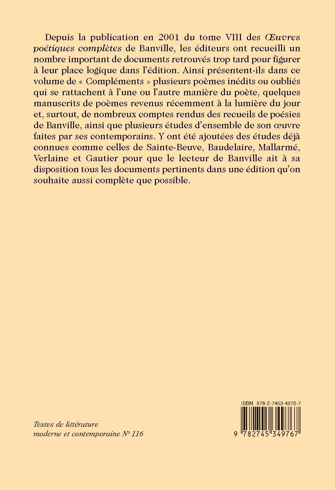 Depuis la publication en 2001 du tome VIII des Œuvres poétiques complètes de Banville, les éditeurs ont recueilli un nombre important de documents retrouvés trop tard pour figurer à leur place logique dans l’édition. Ainsi présentent-ils dans ce volume de « Compléments » plusieurs poèmes inédits ou oubliés qui se rattachent à l’une ou l’autre manière du poète, quelques manuscrits de poèmes revenus récemment à la lumière du jour et, surtout, de nombreux comptes rendus des recueils de poésies de Banville, ainsi que plusieurs études d’ensemble de son oeuvre faites par ses contemporains. Y ont été ajoutées des études déjà connues comme celles de Sainte-Beuve, Baudelaire, Mallarmé, Verlaine et Gautier pour que le lecteur de Banville ait à sa disposition tous les documents pertinents dans une édition qu’on souhaite aussi complète que possible.