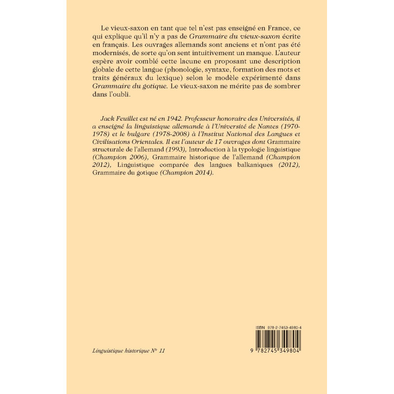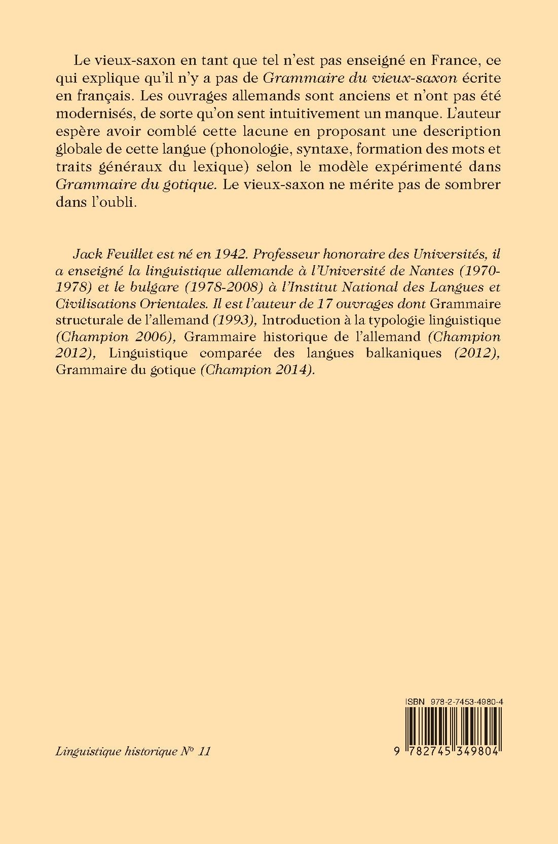 Le vieux-saxon en tant que tel n’est pas enseigné en France, ce qui explique qu’il n’y a pas de Grammaire du vieux-saxon écrite en français. Les ouvrages allemands sont anciens et n’ont pas été modernisés, de sorte qu’on sent intuitivement un manque. L’auteur espère avoir comblé cette lacune en proposant une description globale de cette langue (phonologie, syntaxe, formation des mots et traits généraux du lexique) selon le modèle expérimenté dans Grammaire du gotique. Le vieux-saxon ne mérite pas de sombrer dans l’oubli.