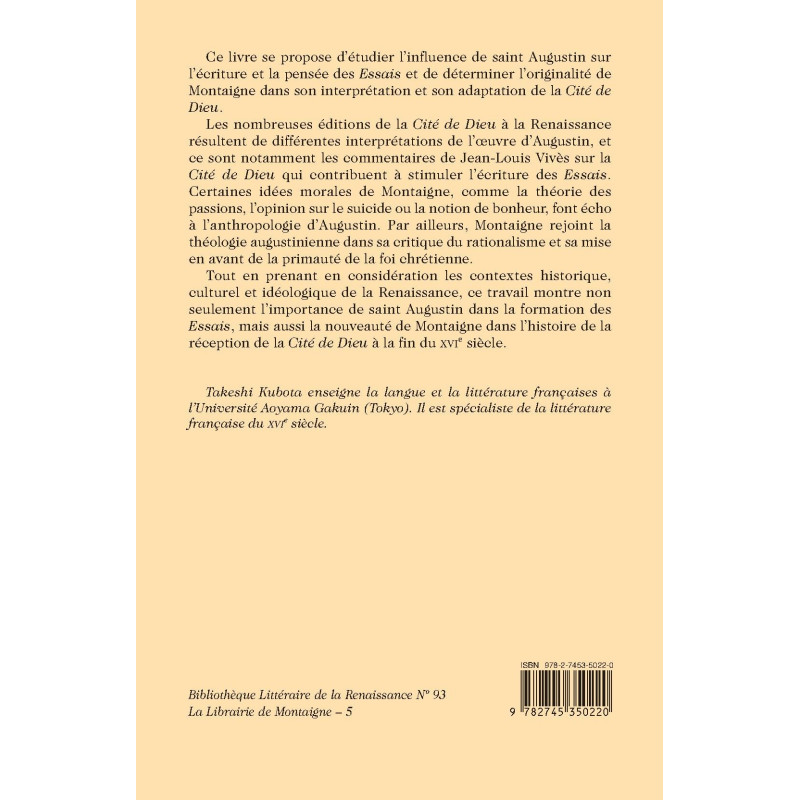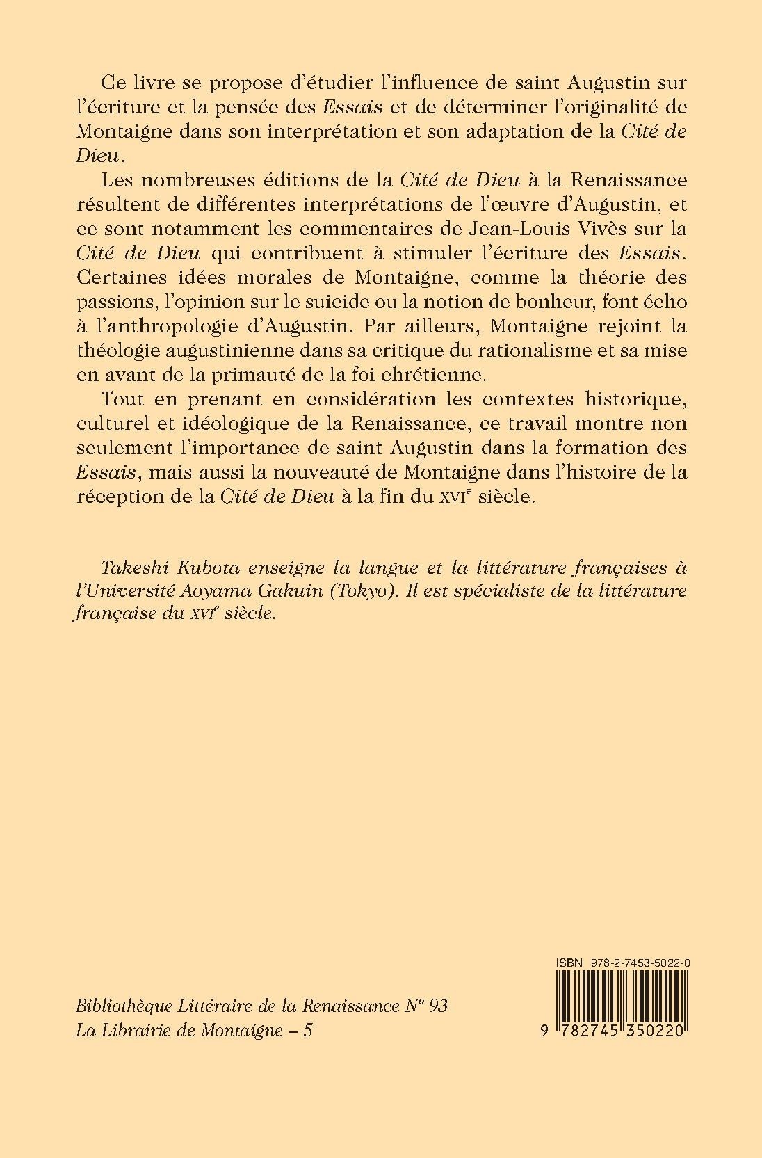 Tout en prenant en considération les contextes historique, culturel et idéologique de la Renaissance, ce travail montre non seulement l’importance de saint Augustin dans la formation des Essais, mais aussi la nouveauté de Montaigne dans l’histoire de la réception de la Cité de Dieu à la fin du XVIe siècle.