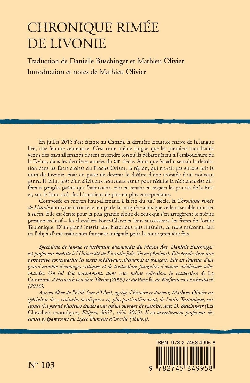 Composée en moyen haut-allemand à la fin du XIIIe siècle, la Chronique rimée de Livonie anonyme raconte le temps de la conquête alors que celle-ci semble toucher à sa fin. Elle est écrite pour la plus grande gloire de ceux qui s’en arrogèrent le mérite presque exclusif – les chevaliers Porte-Glaive et leurs successeurs, les frères de l’ordre Teutonique. D’un grand intérêt tant historique que littéraire, ce texte méconnu fait ici l’objet d’une traduction française intégrale pour la toute première fois.