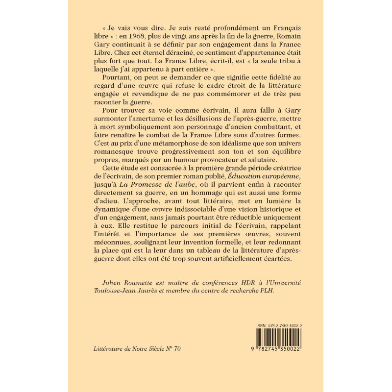 Cette étude est consacrée à la première grande période créatrice de l’écrivain, de son premier roman publié, Éducation européenne, jusqu’à La Promesse de l’aube, où il parvient enfin à raconter directement sa guerre, en un hommage qui est aussi une forme d’adieu. L’approche, avant tout littéraire, met en lumière la dynamique d’une oeuvre indissociable d’une vision historique et d’un engagement, sans jamais pourtant être réductible uniquement à eux. Elle restitue le parcours initial de l’écrivain, rappelant l’intérêt et l’importance de ses premières œuvres, souvent méconnues, soulignant leur invention formelle, et leur redonnant la place qui est la leur dans un tableau de la littérature d’après-guerre dont elles ont été trop souvent artificiellement écartées.