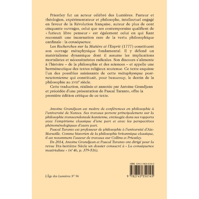 Priestley fut un acteur célébré des Lumières. Pasteur et théologien, expérimentateur et philosophe, intellectuel engagé en faveur de la Révolution française, auteur de plus de cent cinquante ouvrages, celui que ses contemporains qualifient de « furieux libre penseur » est également celui en qui Kant reconnaît une incarnation rare de la vertu philosophique cardinale : la conséquence.