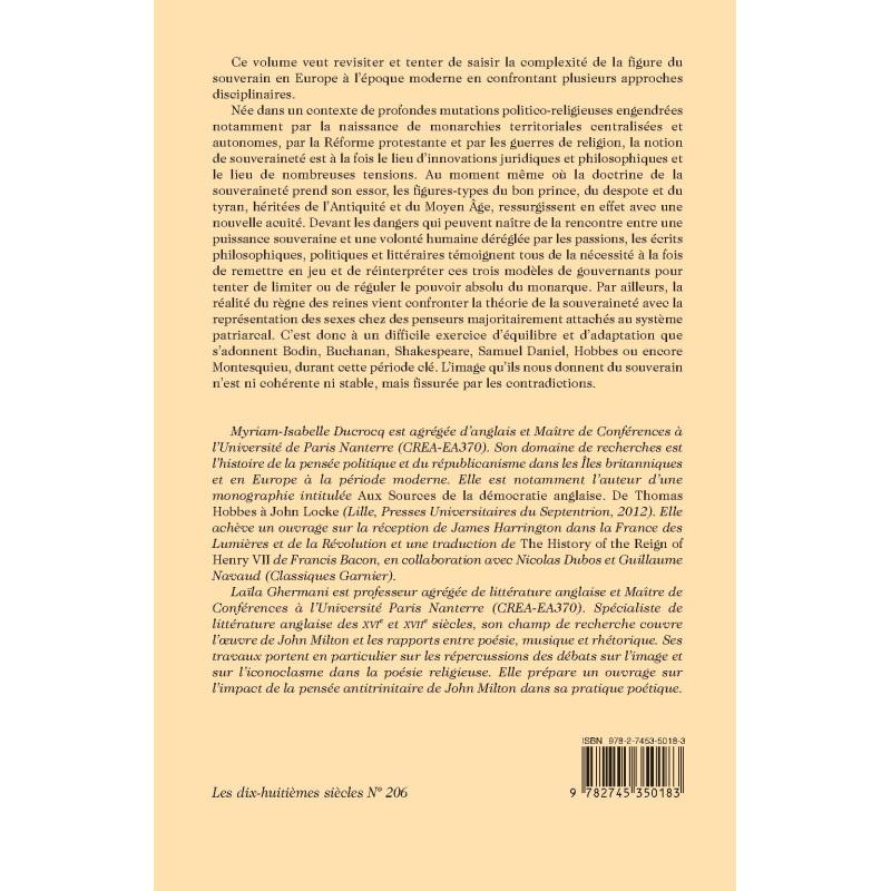 Née dans un contexte de profondes mutations politico-religieuses engendrées notamment par la naissance de monarchies territoriales centralisées et autonomes, par la Réforme protestante et par les guerres de religion, la notion de souveraineté est à la fois le lieu d’innovations juridiques et philosophiques et le lieu de nombreuses tensions. Au moment même où la doctrine de la souveraineté prend son essor, les figures-types du bon prince, du despote et du tyran, héritées de l’Antiquité et du Moyen Âge, ressurgissent en effet avec une nouvelle acuité. Devant les dangers qui peuvent naître de la rencontre entre une puissance souveraine et une volonté humaine déréglée par les passions, les écrits philosophiques, politiques et littéraires témoignent tous de la nécessité à la fois de remettre en jeu et de réinterpréter ces trois modèles de gouvernants pour tenter de limiter ou de réguler le pouvoir absolu du monarque. Par ailleurs, la réalité du règne des reines vient confronter la théorie de la souveraineté avec la représentation des sexes chez des penseurs majoritairement attachés au système patriarcal. C’est donc à un difficile exercice d’équilibre et d’adaptation que s’adonnent Bodin, Buchanan, Shakespeare, Samuel Daniel, Hobbes ou encore Montesquieu, durant cette période clé. L’image qu’ils nous donnent du souverain n’est ni cohérente ni stable, mais fissurée par les contradictions.