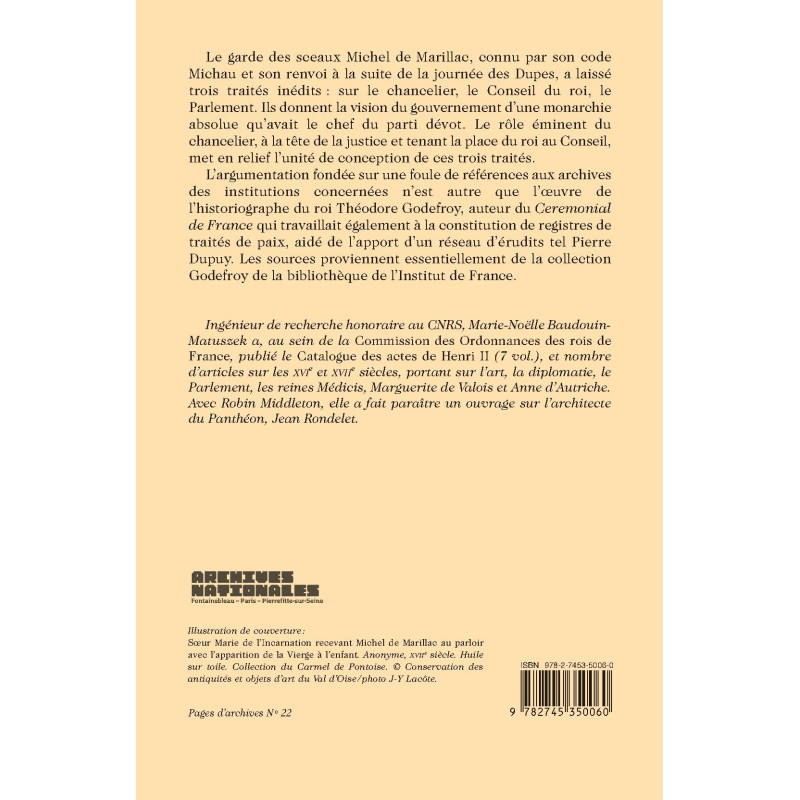 Le garde des sceaux Michel de Marillac, connu par son code Michau et son renvoi à la suite de la journée des Dupes, a laissé trois traités inédits : sur le chancelier, le Conseil du roi, le Parlement. Ils donnent la vision du gouvernement d’une monarchie absolue qu’avait le chef du parti dévot. Le rôle éminent du chancelier, à la tête de la justice et tenant la place du roi au Conseil, met en relief l’unité de conception de ces trois traités.