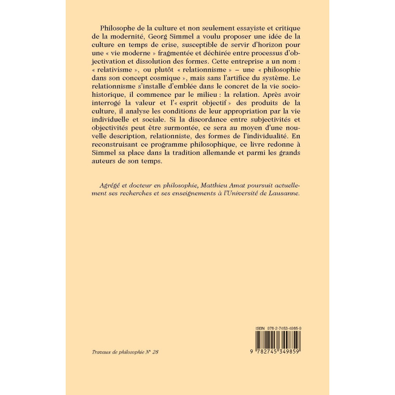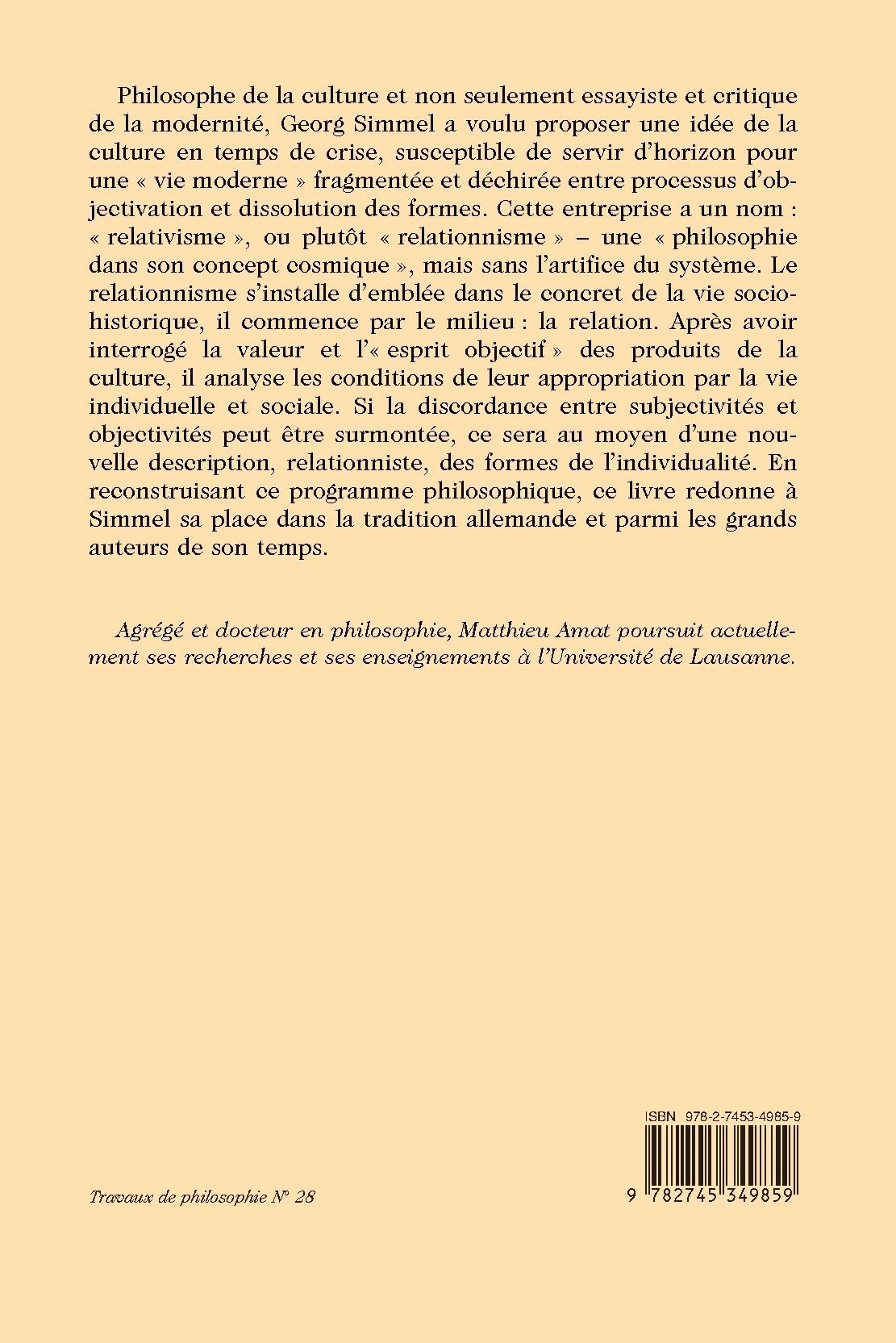 Philosophe de la culture et non seulement essayiste et critique de la modernité, Georg Simmel a voulu proposer une idée de la culture en temps de crise, susceptible de servir d’horizon pour une « vie moderne » fragmentée et déchirée entre processus d’objectivation et dissolution des formes. Cette entreprise a un nom : « relativisme », ou plutôt « relationnisme » – une « philosophie dans son concept cosmique », mais sans l’artifice du système. Le relationnisme s’installe d’emblée dans le concret de la vie sociohistorique, il commence par le milieu : la relation. Après avoir interrogé la valeur et l’« esprit objectif » des produits de la culture, il analyse les conditions de leur appropriation par la vie individuelle et sociale. Si la discordance entre subjectivités et objectivités peut être surmontée, ce sera au moyen d’une nouvelle description, relationniste, des formes de l’individualité. En reconstruisant ce programme philosophique, ce livre redonne à Simmel sa place dans la tradition allemande et parmi les grands auteurs de son temps.