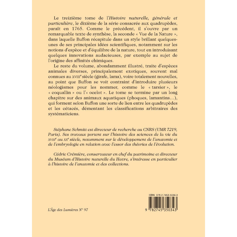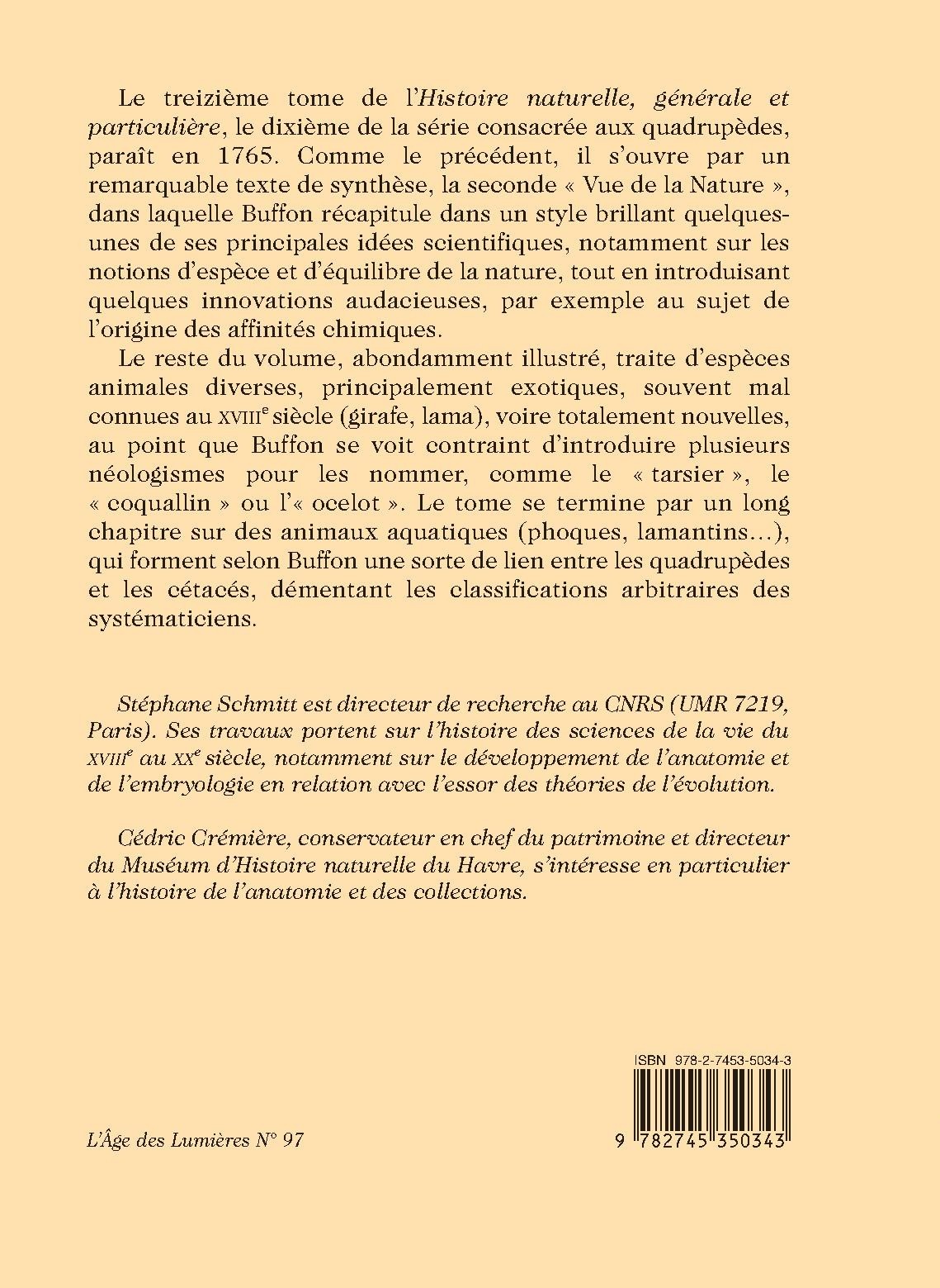 Le treizième tome de l’Histoire naturelle, générale et particulière, le dixième de la série consacrée aux quadrupèdes, paraît en 1765. Comme le précédent, il s’ouvre par un remarquable texte de synthèse, la seconde « Vue de la Nature », dans laquelle Buffon récapitule dans un style brillant quelques-unes de ses principales idées scientifiques, notamment sur les notions d’espèce et d’équilibre de la nature, tout en introduisant quelques innovations audacieuses, par exemple au sujet de l’origine des affinités chimiques.