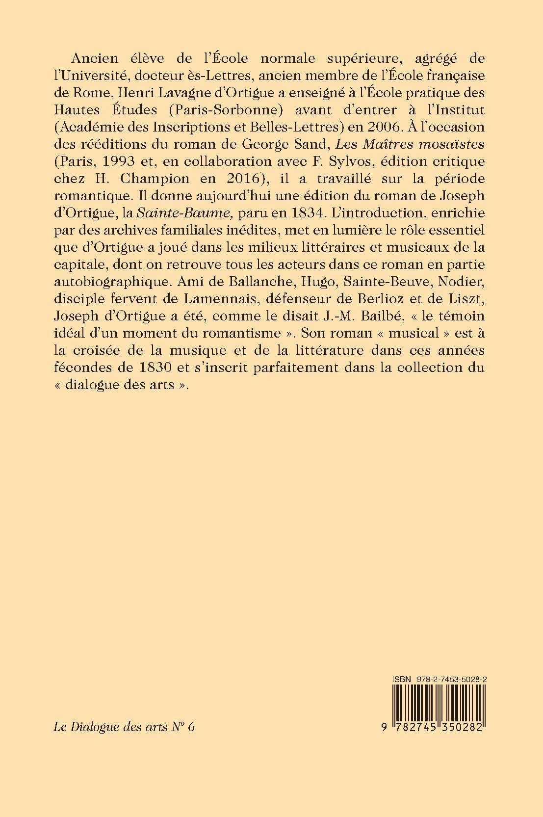 Ancien élève de l’École normale supérieure, agrégé de l’Université, docteur ès-Lettres, ancien membre de l’École française de Rome, Henri Lavagne d’Ortigue a enseigné à l’École pratique des Hautes Études (Paris-Sorbonne) avant d’entrer à l’Institut (Académie des Inscriptions et Belles-Lettres) en 2006. À l’occasion des rééditions du roman de George Sand, Les Maîtres mosaïstes (Paris, 1993 et, en collaboration avec F. Sylvos, édition critique chez H. Champion en 2016), il a travaillé sur la période romantique. Il donne aujourd’hui une édition du roman de Joseph d’Ortigue, la Sainte-Baume, paru en 1834. L’introduction, enrichie par des archives familiales inédites, met en lumière le rôle essentiel que d’Ortigue a joué dans les milieux littéraires et musicaux de la capitale, dont on retrouve tous les acteurs dans ce roman en partie autobiographique. Ami de Ballanche, Hugo, Sainte-Beuve, Nodier, disciple fervent de Lamennais, défenseur de Berlioz et de Liszt, Joseph d’Ortigue a été, comme le disait J.-M. Bailbé, « le témoin idéal d’un moment du romantisme ». Son roman « musical » est à la croisée de la musique et de la littérature dans ces années fécondes de 1830 et s’inscrit parfaitement dans la collection du « dialogue des arts ».