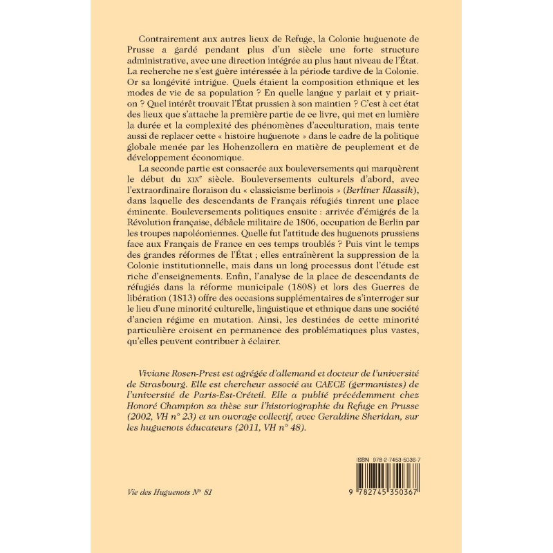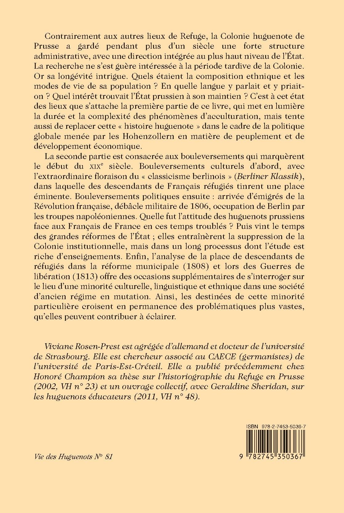 Contrairement aux autres lieux de Refuge, la Colonie huguenote de Prusse a gardé pendant plus d’un siècle une forte structure administrative, avec une direction intégrée au plus haut niveau de l’État. La recherche ne s’est guère intéressée à la période tardive de la Colonie. Or sa longévité intrigue. Quels étaient la composition ethnique et les modes de vie de sa population ? En quelle langue y parlait et y priait-on ? Quel intérêt trouvait l’État prussien à son maintien ? C’est à cet état des lieux que s’attache la première partie de ce livre, qui met en lumière la durée et la complexité des phénomènes d’acculturation, mais tente aussi de replacer cette « histoire huguenote » dans le cadre de la politique globale menée par les Hohenzollern en matière de peuplement et de développement économique.