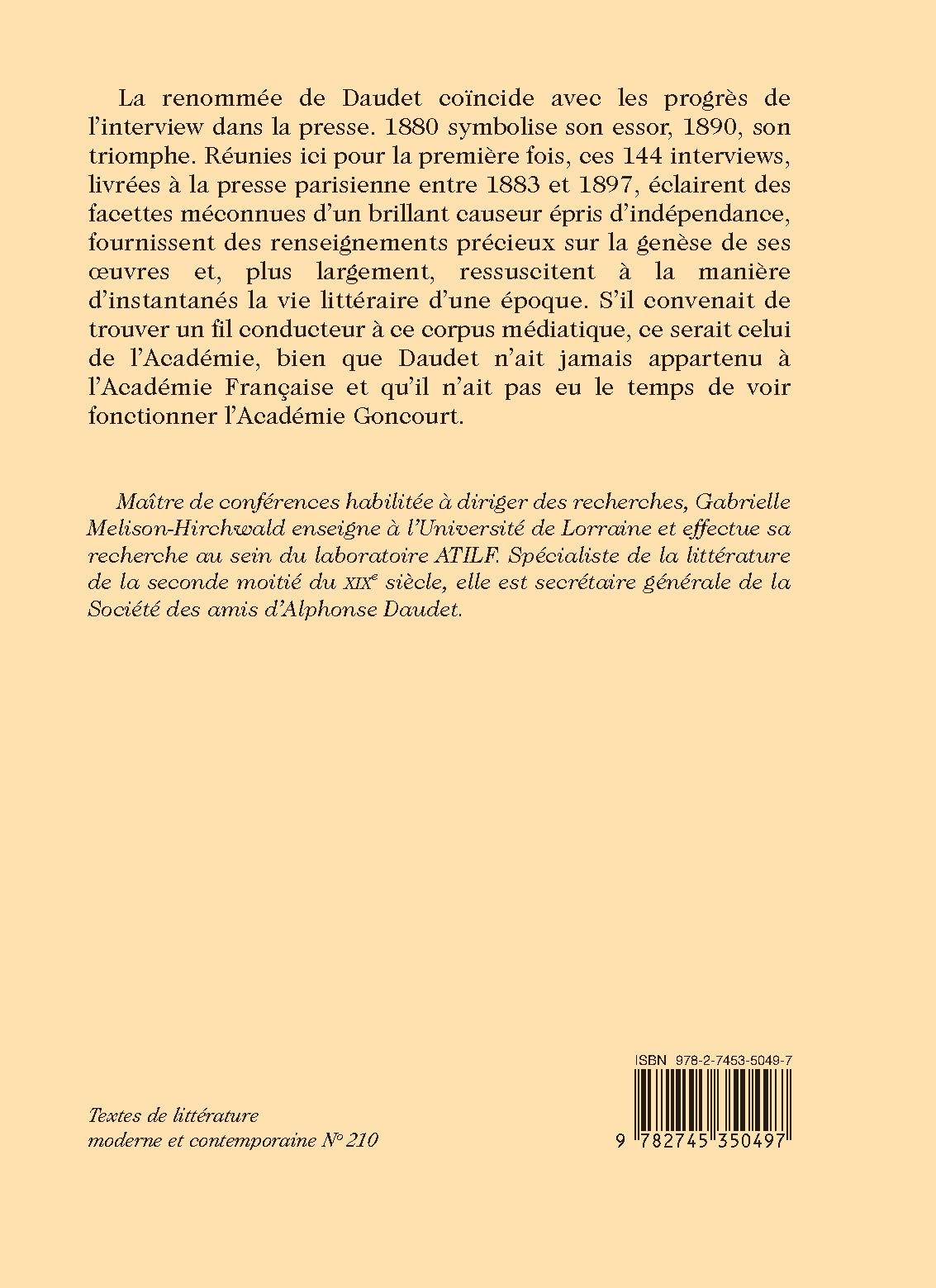 La renommée de Daudet coïncide avec les progrès de l’interview dans la presse. 1880 symbolise son essor, 1890, son triomphe. Réunies ici pour la première fois, ces 144 interviews, livrées à la presse parisienne entre 1883 et 1897, éclairent des facettes méconnues d’un brillant causeur épris d’indépendance, fournissent des renseignements précieux sur la genèse de ses œuvres et, plus largement, ressuscitent à la manière d’instantanés la vie littéraire d’une époque. S’il convenait de trouver un fil conducteur à ce corpus médiatique, ce serait celui de l’Académie, bien que Daudet n’ait jamais appartenu à l’Académie Française et qu’il n’ait pas eu le temps de voir fonctionner l’Académie Goncourt.