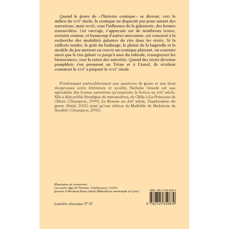 S’intéressant particulièrement aux questions de genre et aux liens réciproques entre littérature et société, Nathalie Grande est une spécialiste des formes narratives qu’emprunte la fiction au XVIIe siècle. Elle a déjà publié Stratégies de romancières, de Clélie à La Princesse de Clèves (Champion, 1999), Le Roman au XVIIe siècle, l’exploration du genre (Bréal, 2002) ainsi qu’une édition de Mathilde de Madeleine de Scudéry (Champion, 2002).