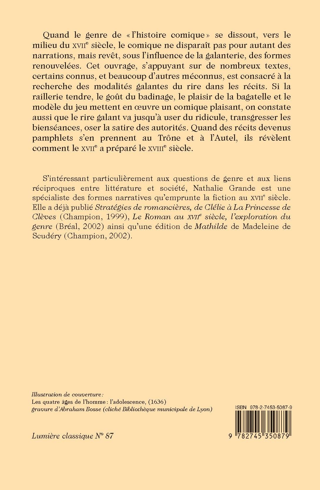 Quand le genre de « l’histoire comique » se dissout, vers le milieu du XVIIe siècle, le comique ne disparaît pas pour autant des narrations, mais revêt, sous l’influence de la galanterie, des formes renouvelées. Cet ouvrage, s’appuyant sur de nombreux textes, certains connus, et beaucoup d’autres méconnus, est consacré à la recherche des modalités galantes du rire dans les récits. Si la raillerie tendre, le goût du badinage, le plaisir de la bagatelle et le modèle du jeu mettent en oeuvre un comique plaisant, on constate aussi que le rire galant va jusqu’à user du ridicule, transgresser les bienséances, oser la satire des autorités. Quand des récits devenus pamphlets s’en prennent au Trône et à l’Autel, ils révèlent comment le XVIIe a préparé le XVIIIe siècle.