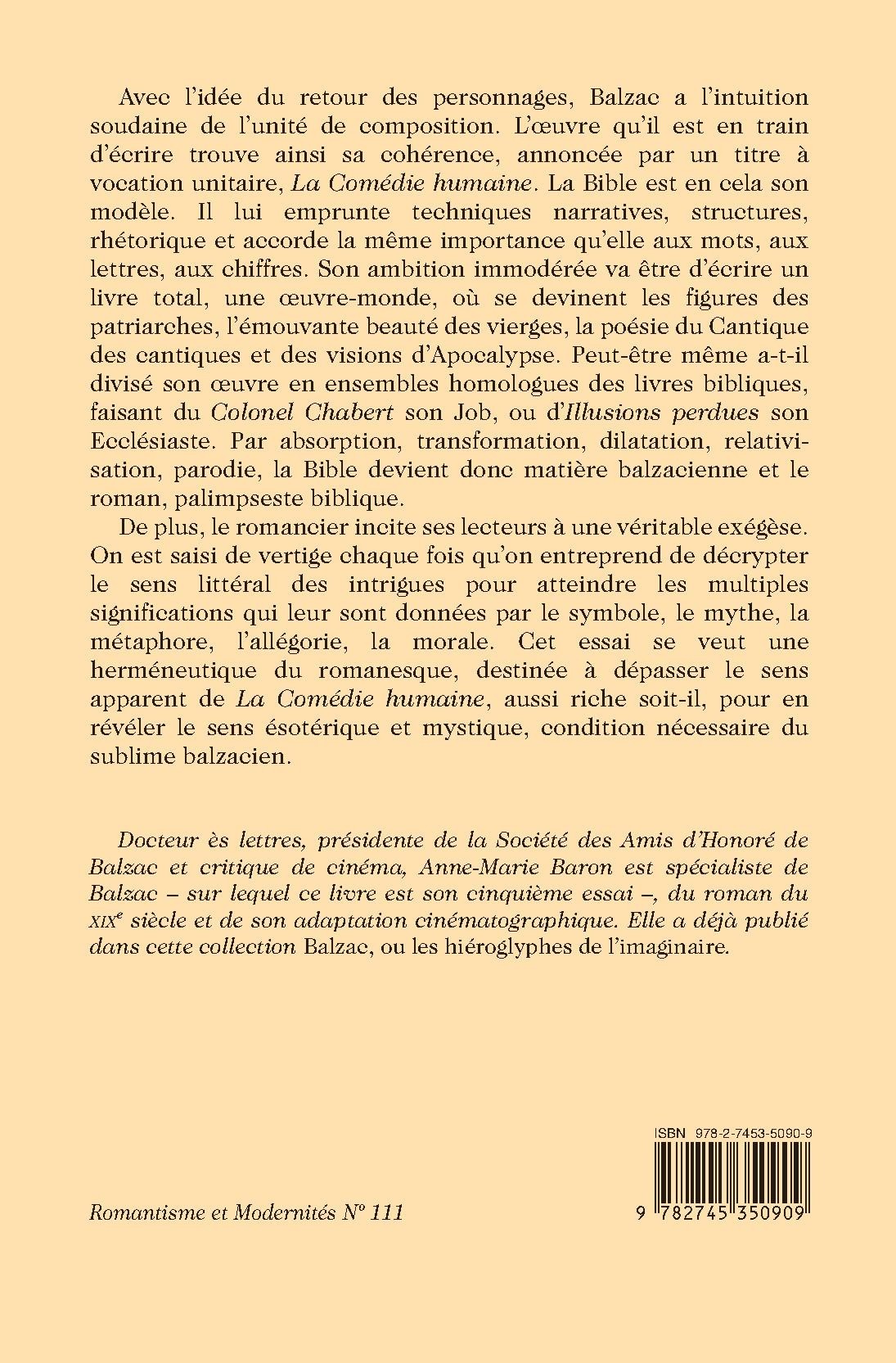 Avec l’idée du retour des personnages, Balzac a l’intuition soudaine de l’unité de composition. L’oeuvre qu’il est en train d’écrire trouve ainsi sa cohérence, annoncée par un titre à vocation unitaire, La Comédie humaine. La Bible est en cela son modèle. Il lui emprunte techniques narratives, structures, rhétorique et accorde la même importance qu’elle aux mots, aux lettres, aux chiffres. Son ambition immodérée va être d’écrire un livre total, une oeuvre-monde, où se devinent les figures des patriarches, l’émouvante beauté des vierges, la poésie du Cantique des cantiques et des visions d’Apocalypse. Peut-être même a-t-il divisé son oeuvre en ensembles homologues des livres bibliques, faisant du Colonel Chabert son Job, ou d’Illusions perdues son Ecclésiaste. Par absorption, transformation, dilatation, relativisation, parodie, la Bible devient donc matière balzacienne et le roman, palimpseste biblique.