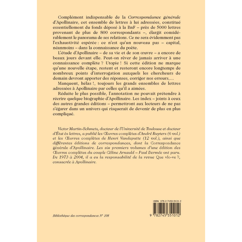 Complément indispensable de la Correspondance générale d’Apollinaire, cet ensemble de lettres à lui adressées, constitué essentiellement du fonds déposé à la BnF – près de 5000 lettres provenant de plus de 800 correspondants – élargit considérablement le panorama de ses relations. Ce ne sera évidemment pas l’exhaustivité espérée : ce n’est qu’un nouveau pas – capital, néanmoins – dans la connaissance du poète.