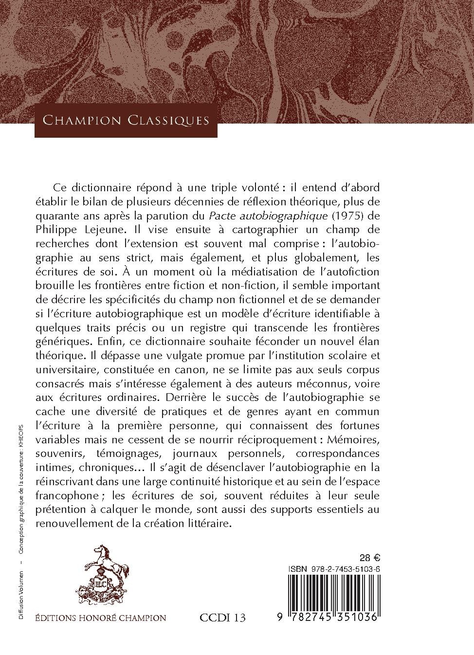 Ce dictionnaire répond à une triple volonté : il entend d’abord établir le bilan de plusieurs décennies de réflexion théorique, plus de quarante ans après la parution du Pacte autobiographique (1975) de Philippe Lejeune. Il vise ensuite à cartographier un champ de recherches dont l’extension est souvent mal comprise : l’autobiographie au sens strict, mais également, et plus globalement, les écritures de soi. À un moment où la médiatisation de l’autofiction brouille les frontières entre fiction et non-fiction, il semble important de décrire les spécificités du champ non fictionnel et de se demander si l’écriture autobiographique est un modèle d’écriture identifiable à quelques traits précis ou un registre qui transcende les frontières génériques. Enfin, ce dictionnaire souhaite féconder un nouvel élan théorique. Il dépasse une vulgate promue par l’institution scolaire et universitaire, constituée en canon, ne se limite pas aux seuls corpus consacrés mais s’intéresse également à des auteurs méconnus, voire aux écritures ordinaires. Derrière le succès de l’autobiographie se cache une diversité de pratiques et de genres ayant en commun l’écriture à la première personne, qui connaissent des fortunes variables mais ne cessent de se nourrir réciproquement : Mémoires, souvenirs, témoignages, journaux personnels, correspondances intimes, chroniques… Il s’agit de désenclaver l’autobiographie en la réinscrivant dans une large continuité historique et au sein de l’espace francophone ; les écritures de soi, souvent réduites à leur seule prétention à calquer le monde, sont aussi des supports essentiels au renouvellement de la création littéraire.