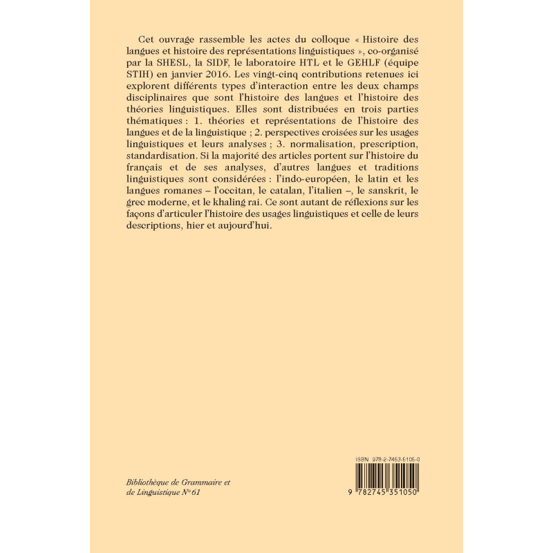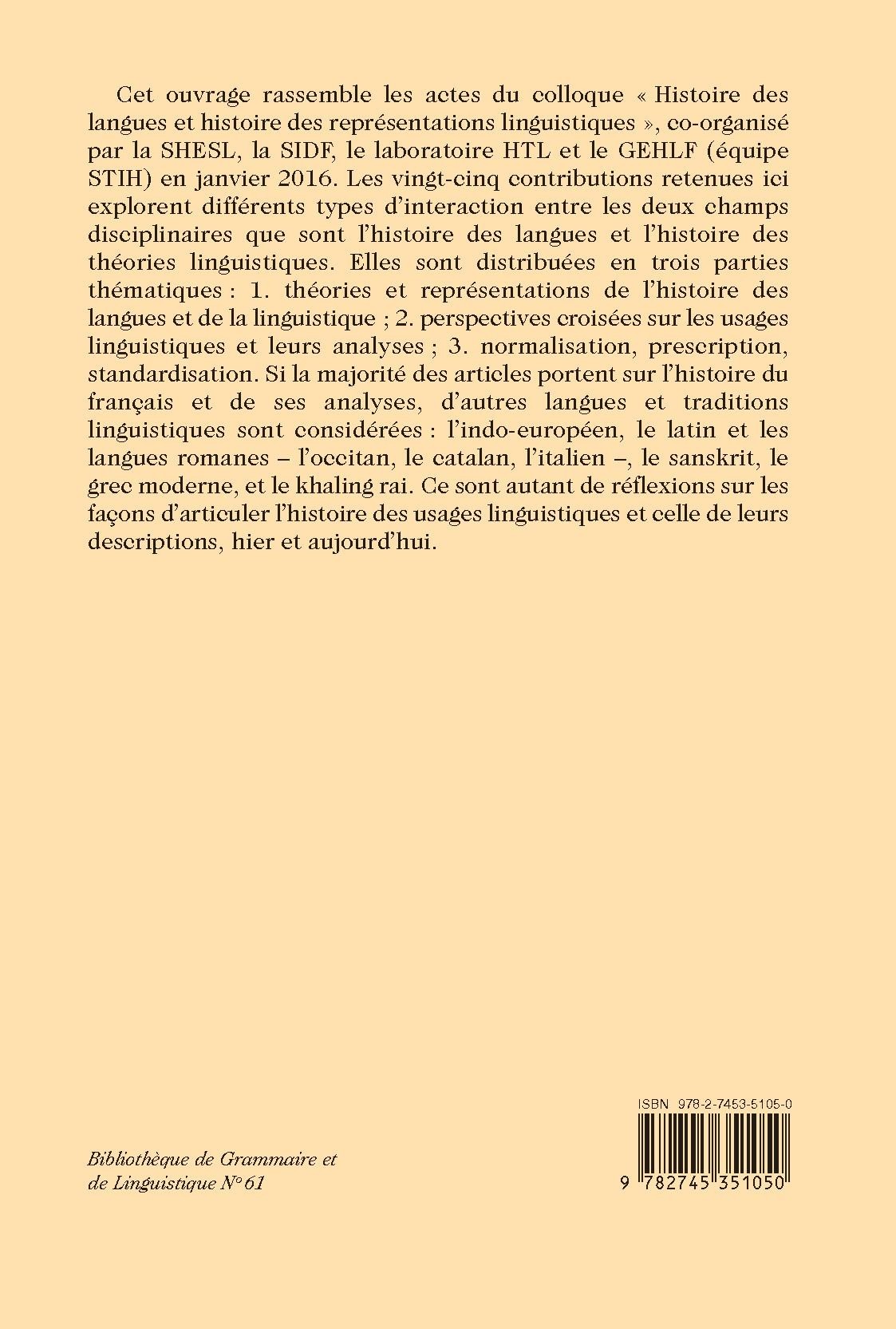 Cet ouvrage rassemble les actes du colloque « Histoire des langues et histoire des représentations linguistiques », co-organisé par la SHESL, la SIDF, le laboratoire HTL et le GEHLF (équipe STIH) en janvier 2016. Les vingt-cinq contributions retenues ici explorent différents types d’interaction entre les deux champs disciplinaires que sont l’histoire des langues et l’histoire des théories linguistiques. Elles sont distribuées en trois parties thématiques : 1. théories et représentations de l’histoire des langues et de la linguistique ; 2. perspectives croisées sur les usages linguistiques et leurs analyses ; 3. normalisation, prescription, standardisation. Si la majorité des articles portent sur l’histoire du français et de ses analyses, d’autres langues et traditions linguistiques sont considérées : l’indo-européen, le latin et les langues romanes – l’occitan, le catalan, l’italien –, le sanskrit, le grec moderne, et le khaling rai. Ce sont autant de réflexions sur les façons d’articuler l’histoire des usages linguistiques et celle de leurs descriptions, hier et aujourd’hui.