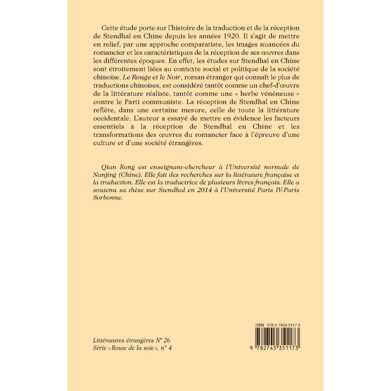 Cette étude porte sur l’histoire de la traduction et de la réception de Stendhal en Chine depuis les années 1920. Il s’agit de mettre en relief, par une approche comparatiste, les images nuancées du romancier et les caractéristiques de la réception de ses œuvres dans les différentes époques. En effet, les études sur Stendhal en Chine sont étroitement liées au contexte social et politique de la société chinoise. Le Rouge et le Noir, roman étranger qui connaît le plus de traductions chinoises, est considéré tantôt comme un chef-d’œuvre de la littérature réaliste, tantôt comme une « herbe vénéneuse » contre le Parti communiste. La réception de Stendhal en Chine reflète, dans une certaine mesure, celle de toute la littérature occidentale. L’auteur a essayé de mettre en évidence les facteurs essentiels à la réception de Stendhal en Chine et les transformations des œuvres du romancier face à l’épreuve d’une culture et d’une société étrangères.