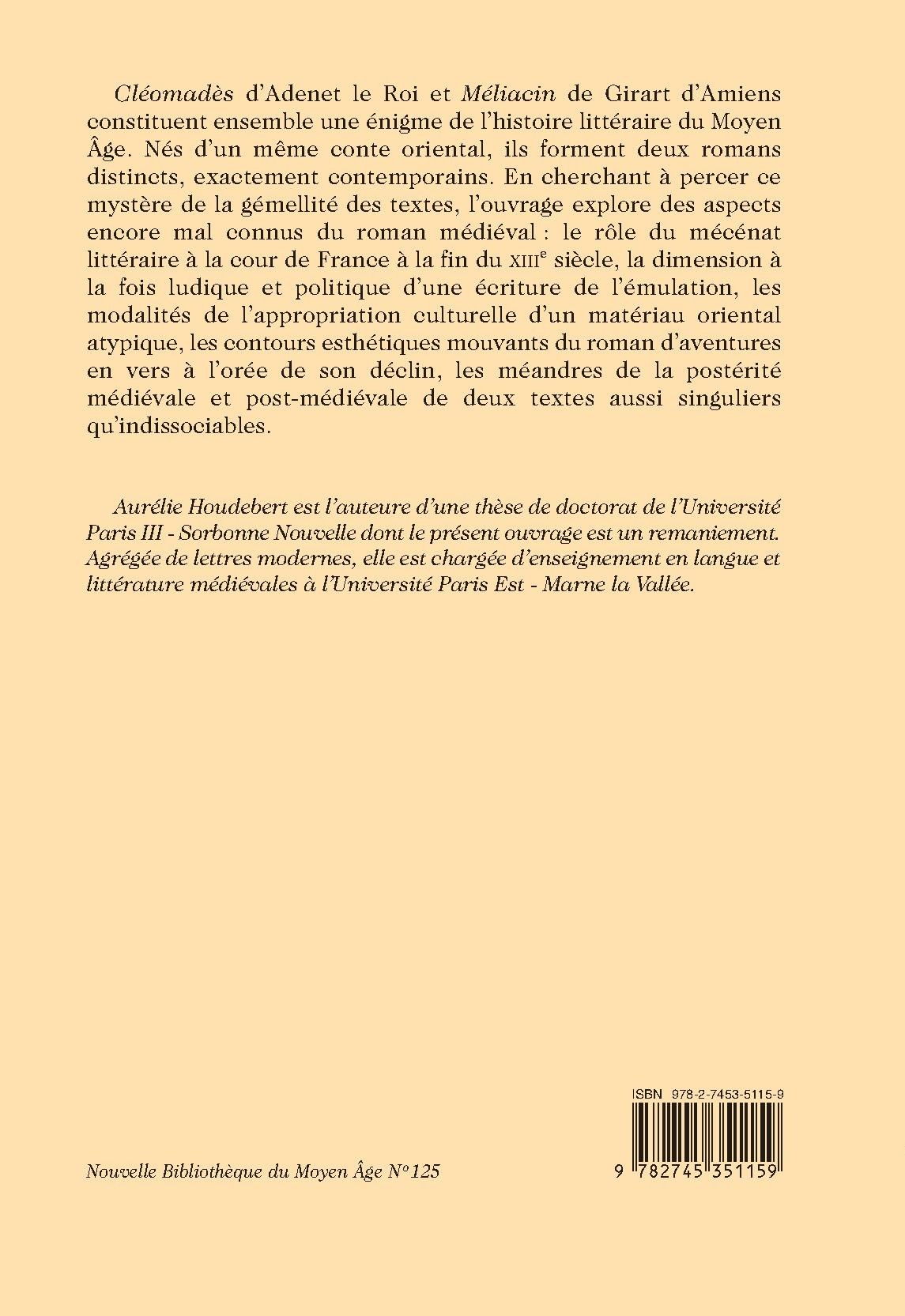 Cléomadès d’Adenet le Roi et Méliacin de Girart d’Amiens constituent ensemble une énigme de l’histoire littéraire du Moyen Âge. Nés d’un même conte oriental, ils forment deux romans distincts, exactement contemporains. En cherchant à percer ce mystère de la gémellité des textes, l’ouvrage explore des aspects encore mal connus du roman médiéval : le rôle du mécénat littéraire à la cour de France à la fin du XIIIe siècle, la dimension à la fois ludique et politique d’une écriture de l’émulation, les modalités de l’appropriation culturelle d’un matériau oriental atypique, les contours esthétiques mouvants du roman d’aventures en vers à l’orée de son déclin, les méandres de la postérité médiévale et post-médiévale de deux textes aussi singuliers qu’indissociables.