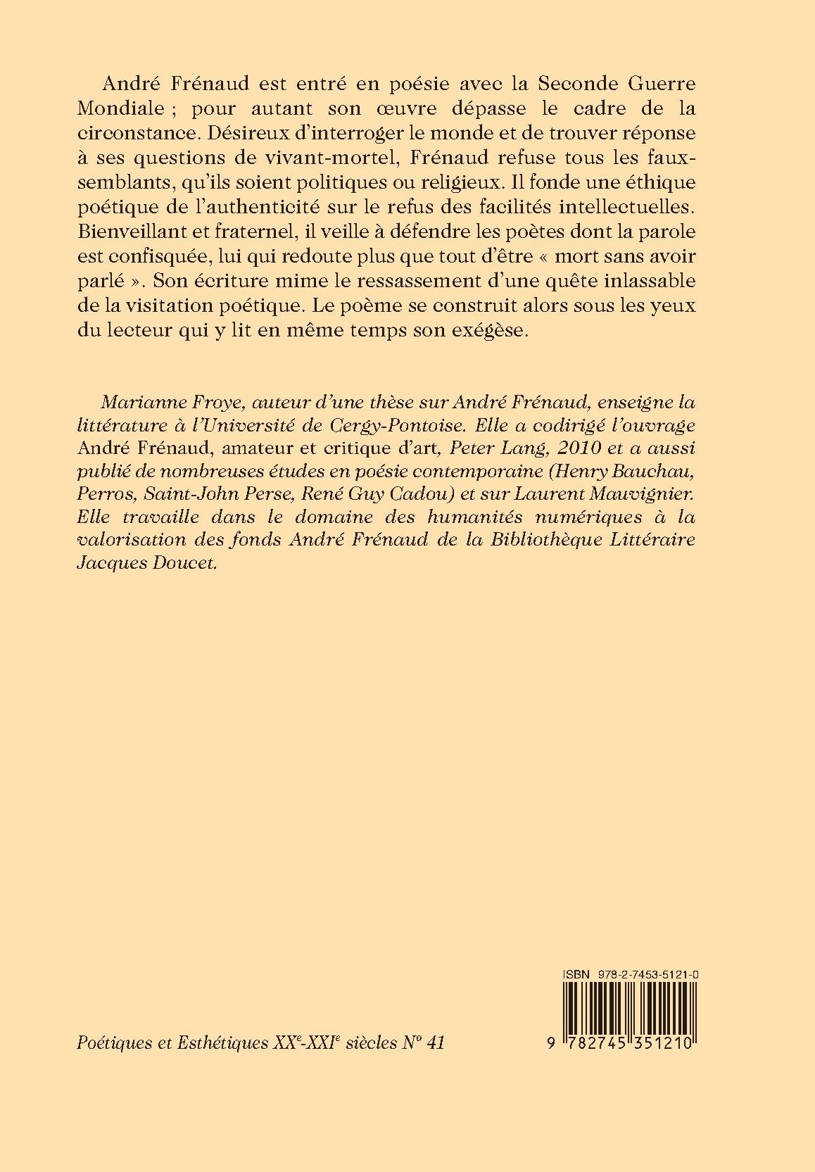 André Frénaud est entré en poésie avec la Seconde Guerre Mondiale ; pour autant son oeuvre dépasse le cadre de la circonstance. Désireux d’interroger le monde et de trouver réponse à ses questions de vivant-mortel, Frénaud refuse tous les faux-semblants, qu’ils soient politiques ou religieux. Il fonde une éthique poétique de l’authenticité sur le refus des facilités intellectuelles. Bienveillant et fraternel, il veille à défendre les poètes dont la parole est confisquée, lui qui redoute plus que tout d’être « mort sans avoir parlé ». Son écriture mime le ressassement d’une quête inlassable de la visitation poétique. Le poème se construit alors sous les yeux du lecteur qui y lit en même temps son exégèse.