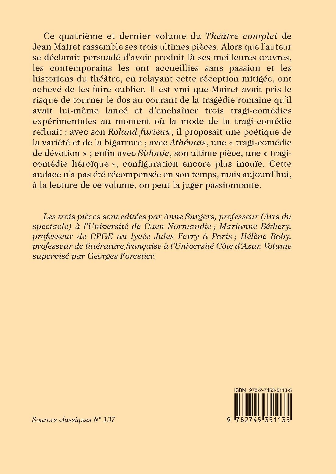 Ce quatrième et dernier volume du Théâtre complet de Jean Mairet rassemble ses trois ultimes pièces. Alors que l’auteur se déclarait persuadé d’avoir produit là ses meilleures œuvres, les contemporains les ont accueillies sans passion et les historiens du théâtre, en relayant cette réception mitigée, ont achevé de les faire oublier. Il est vrai que Mairet avait pris le risque de tourner le dos au courant de la tragédie romaine qu’il avait lui-même lancé et d’enchaîner trois tragi-comédies expérimentales au moment où la mode de la tragi-comédie refluait : avec son Roland furieux, il proposait une poétique de la variété et de la bigarrure ; avec Athénaïs, une « tragi-comédie de dévotion » ; enfin avec Sidonie, son ultime pièce, une « tragicomédie héroïque », configuration encore plus inouïe. Cette audace n’a pas été récompensée en son temps, mais aujourd’hui, à la lecture de ce volume, on peut la juger passionnante.