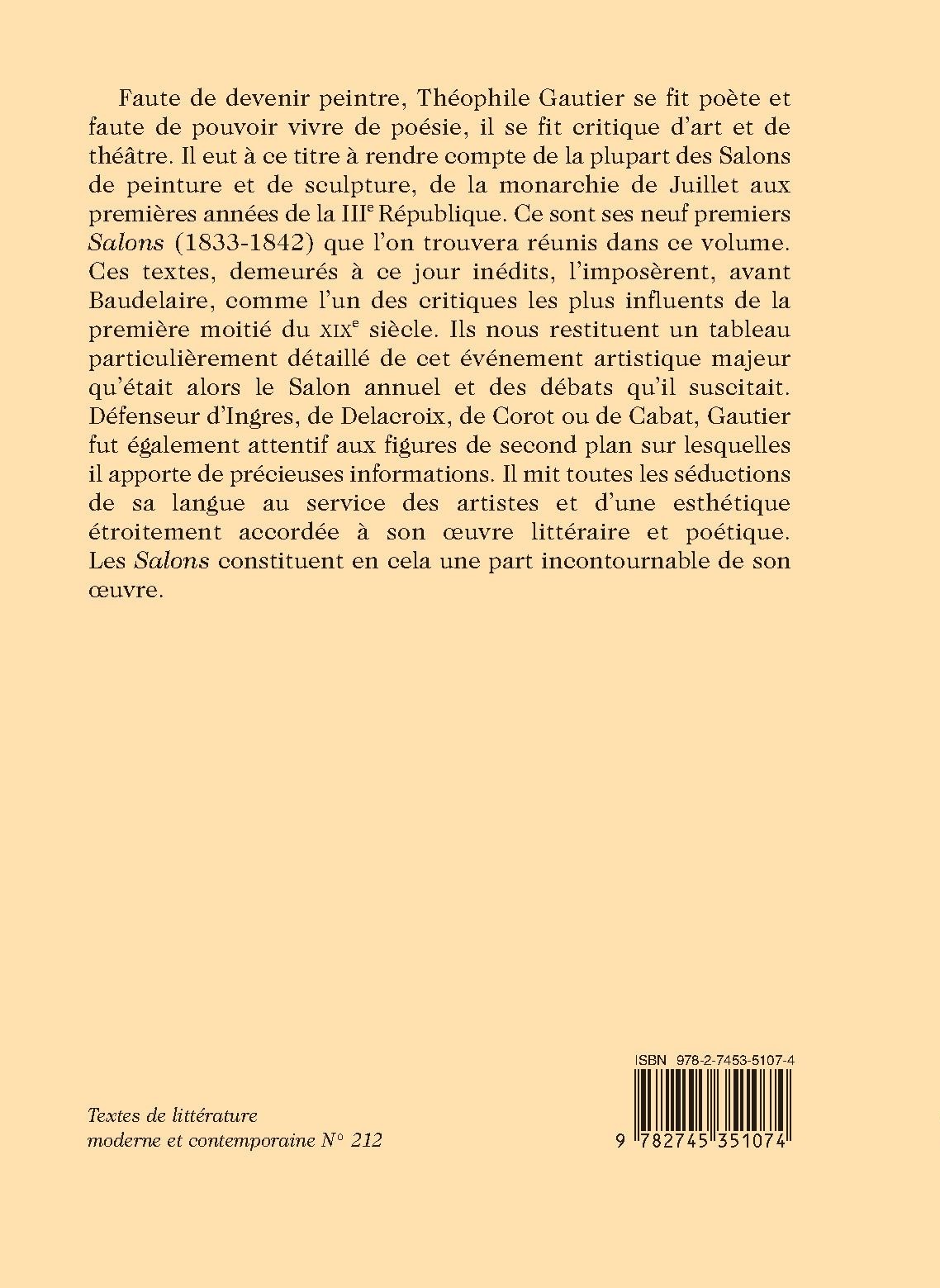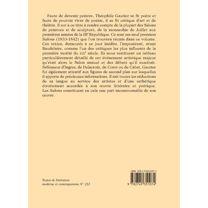 Faute de devenir peintre, Théophile Gautier se fit poète et faute de pouvoir vivre de poésie, il se fit critique d’art et de théâtre. Il eut à ce titre à rendre compte de la plupart des Salons de peinture et de sculpture, de la monarchie de Juillet aux premières années de la IIIe République. Ce sont ses neuf premiers Salons (1833-1842) que l’on trouvera réunis dans ce volume. Ces textes, demeurés à ce jour inédits, l’imposèrent, avant Baudelaire, comme l’un des critiques les plus influents de la première moitié du XIXe siècle. Ils nous restituent un tableau particulièrement détaillé de cet événement artistique majeur qu’était alors le Salon annuel et des débats qu’il suscitait. Défenseur d’Ingres, de Delacroix, de Corot ou de Cabat, Gautier fut également attentif aux figures de second plan sur lesquelles il apporte de précieuses informations. Il mit toutes les séductions de sa langue au service des artistes et d’une esthétique étroitement accordée à son oeuvre littéraire et poétique. Les Salons constituent en cela une part incontournable de son oeuvre.