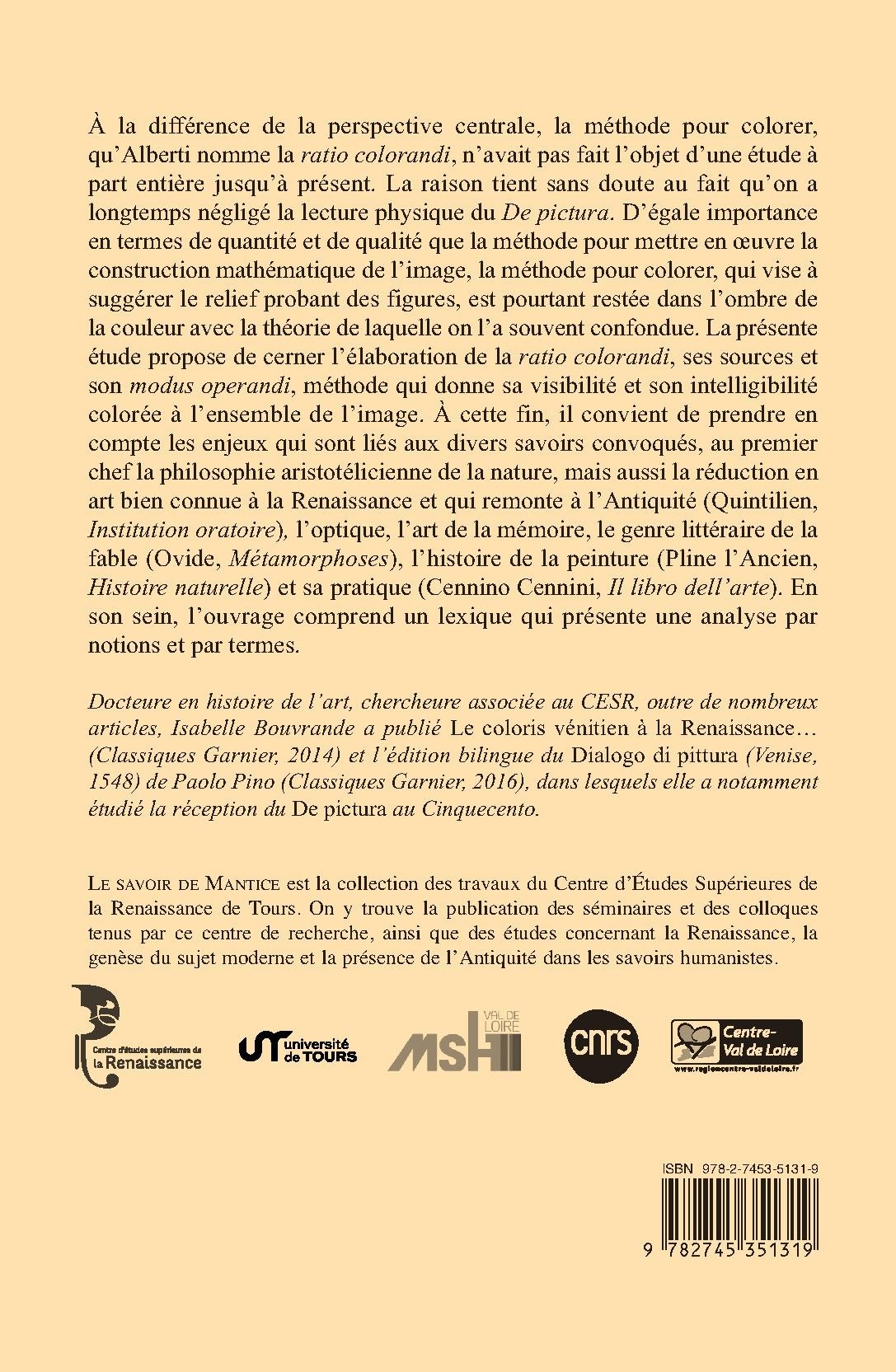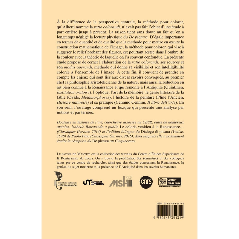 Docteure en histoire de l’art, chercheure associée au CESR, outre de nombreux articles, Isabelle Bouvrande a publié Le coloris vénitien à la Renaissance… (Classiques Garnier, 2014) et l’édition bilingue du Dialogo di pittura (Venise, 1548) de Paolo Pino (Classiques Garnier, 2016), dans lesquels elle a notamment étudié la réception du De pictura au Cinquecento.